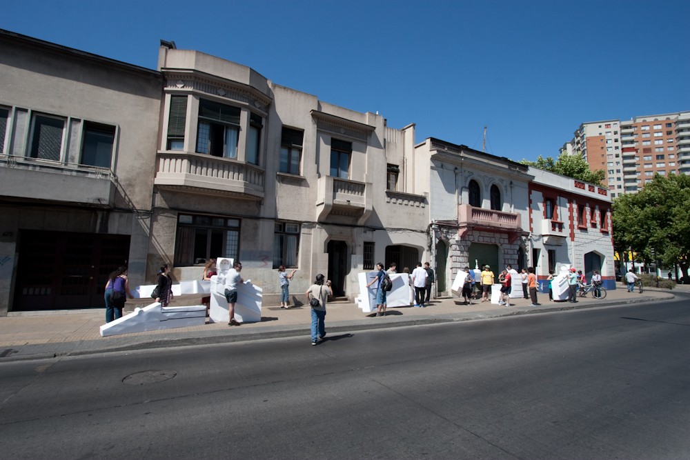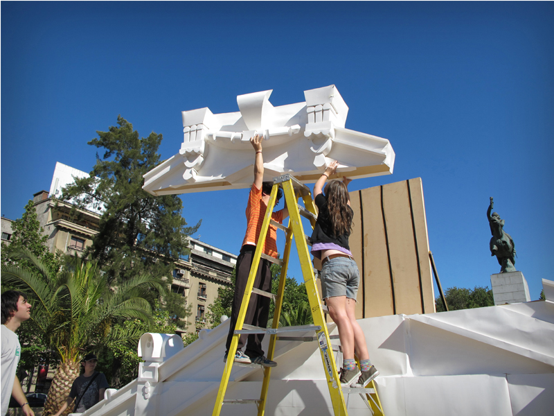 Inaugurated for the Chilean Centennial in 1910, and demoli- shed three decades later, the Pirque railway station, designed in the French neoclassical style by architect Emilio Jequier, was located in what is today the entrance to the Baquedano subway station, at the geographic and symbolic center of Santiago. The card stock reproduction was installed in the same site, after being transported piece by piece by a group of people, on foot, through Bustamante Park, where the train tracks used to pass into the now-vanished station. The card stock façade was then left at the site formerly occupied by the station, where it remai- ned for as long as the material allowed, subjected to the effects associated with exposure to the elements, to the city.