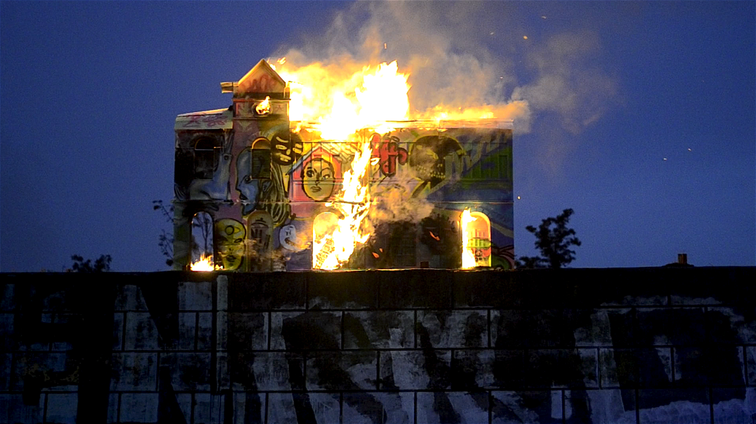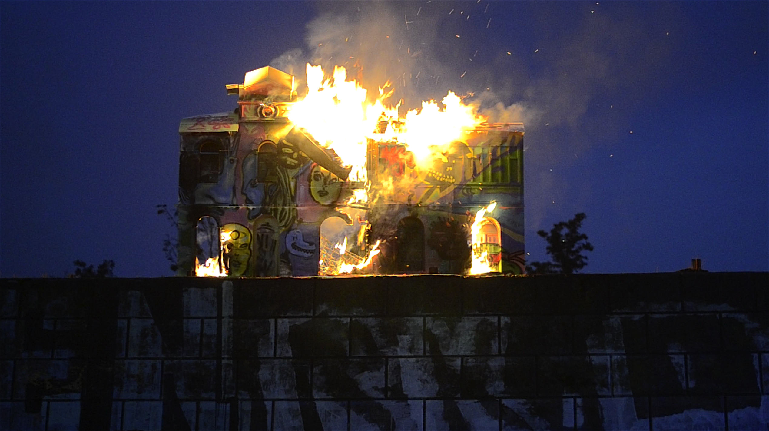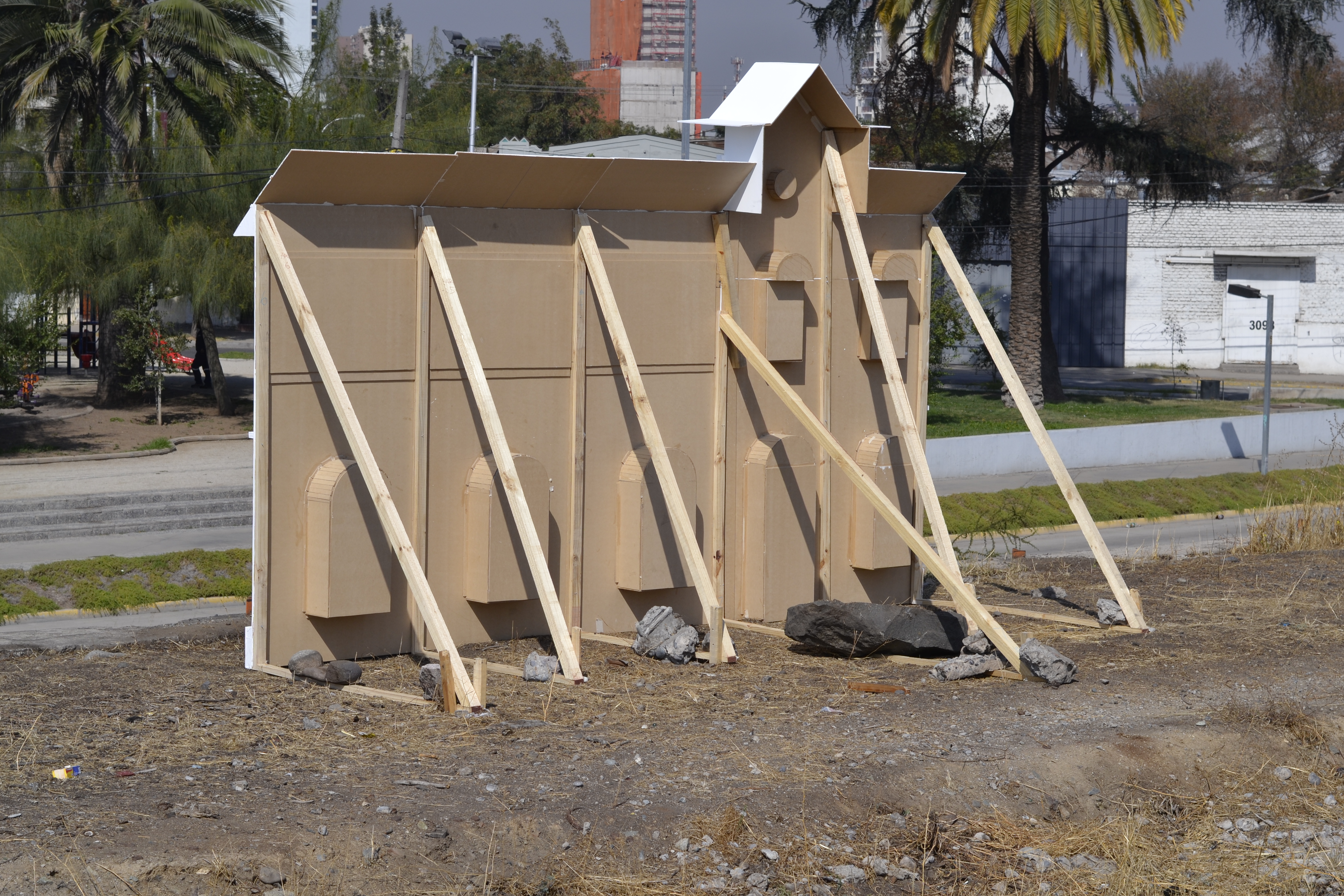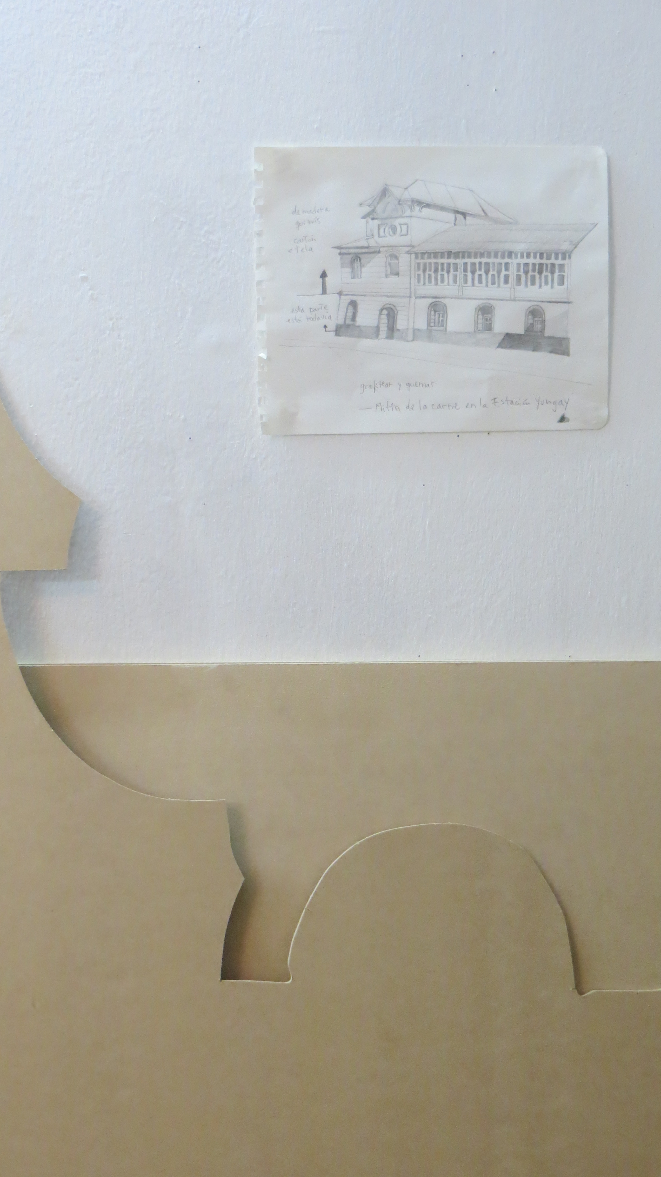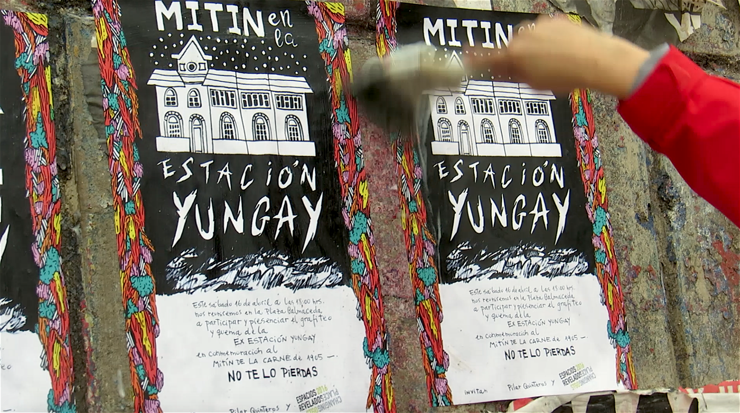 Mitin en la estación Yungay is a visual arts project realised in the frame of the “Espacios Revelados 2016” event. It’s about the installation of a scale wooden model of the old Yungay station (Balmaceda Avenue with Carrascal), destroyed in a fire during the first half of the 20th century during massive protests in the city of Santiago, Chile. This model was placed on top of the ruins of the old building’s ground floor, thus making the latter a part of the installation as a whole. Afterwards, the model was painted by local graffiti artists and burned in a public act.