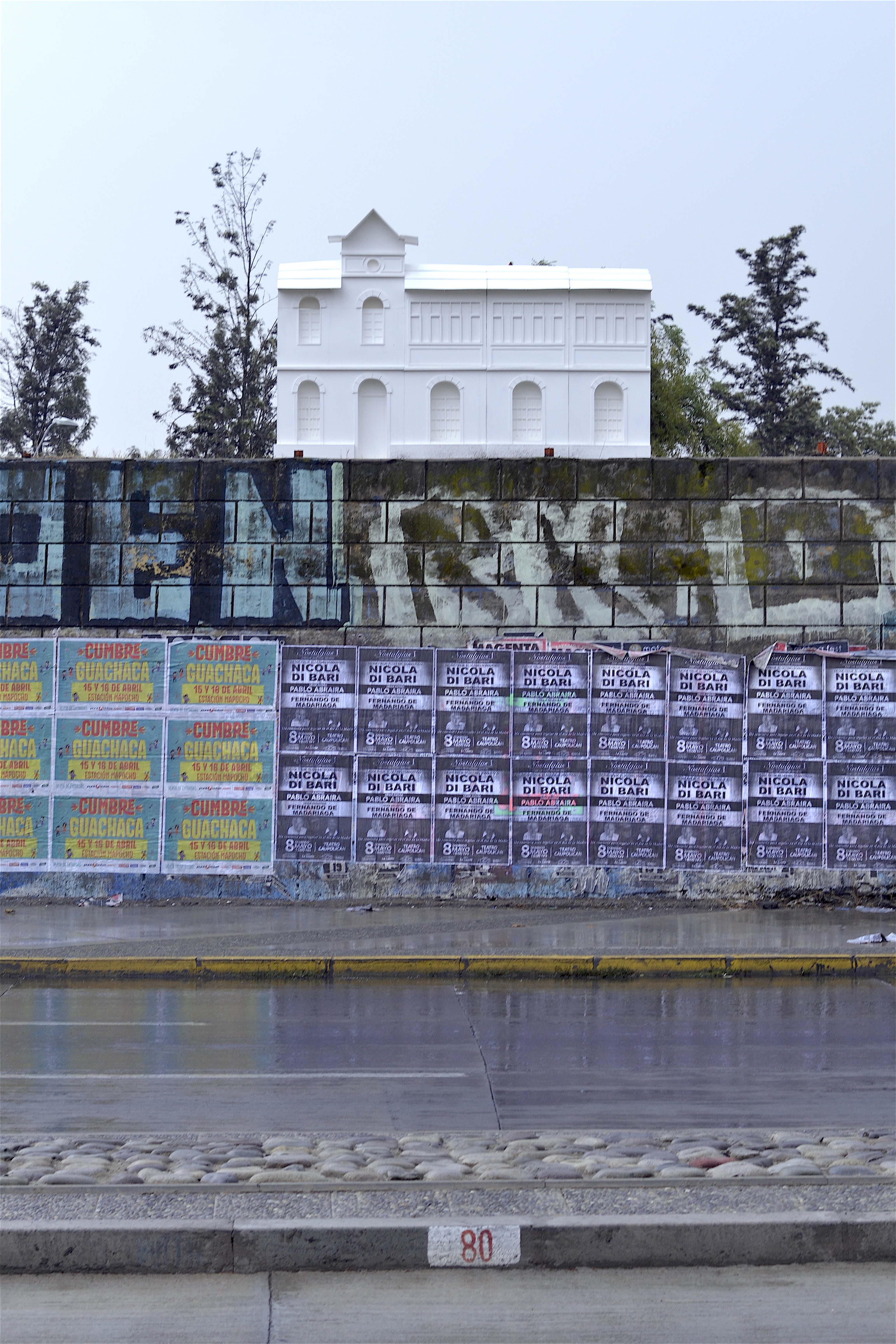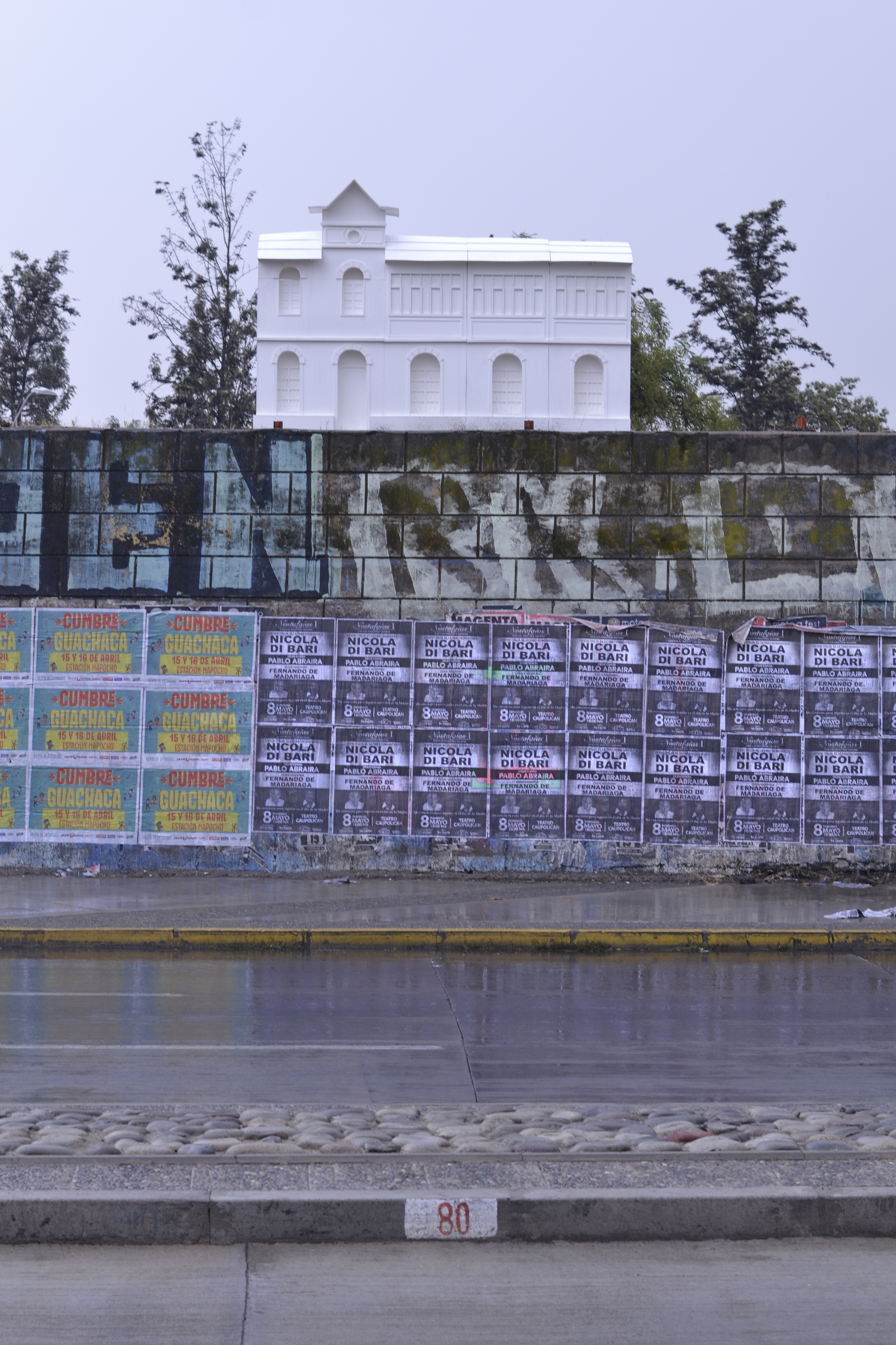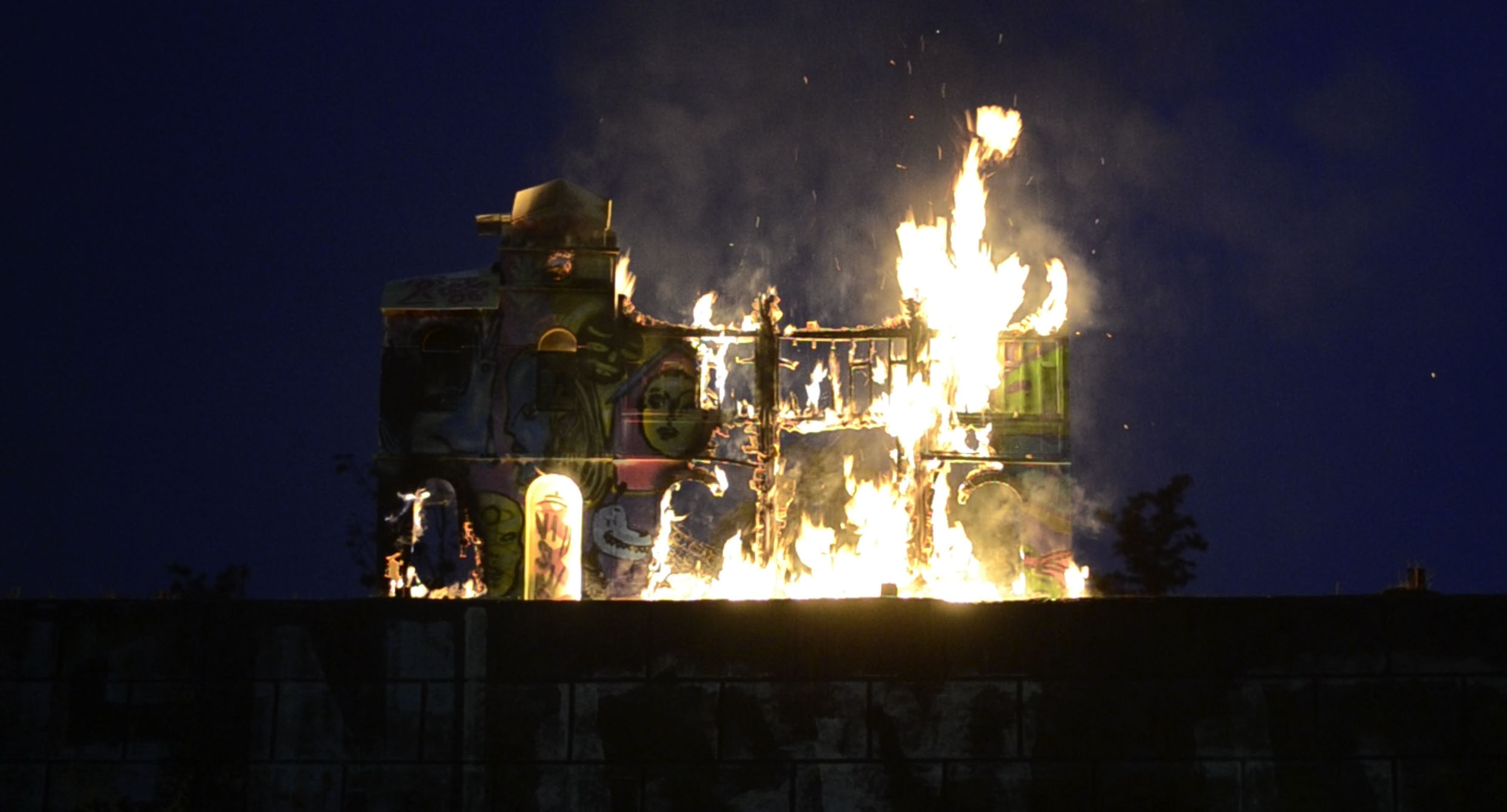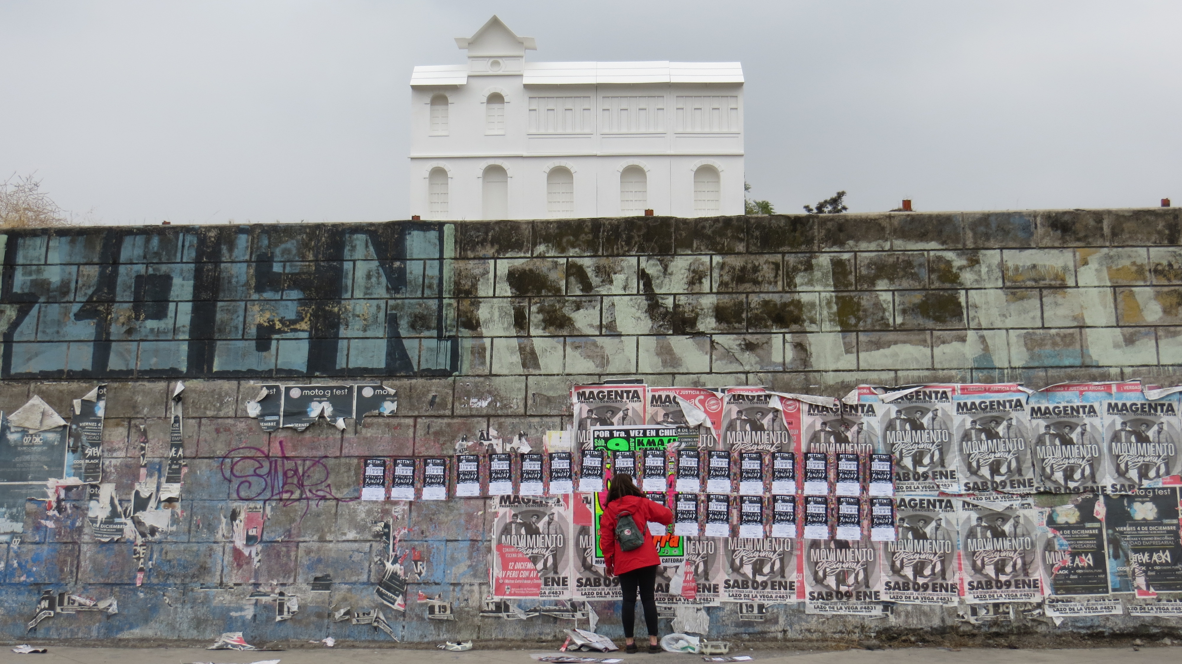 Mitin en la estación Yungay is a visual arts project realised in the frame of the “Espacios Revelados 2016” event. It’s about the installation of a scale wooden model of the old Yungay station (Balmaceda Avenue with Carrascal), destroyed in a fire during the first half of the 20th century during massive protests in the city of Santiago, Chile. This model was placed on top of the ruins of the old building’s ground floor, thus making the latter a part of the installation as a whole. Afterwards, the model was painted by local graffiti artists and burned in a public act.