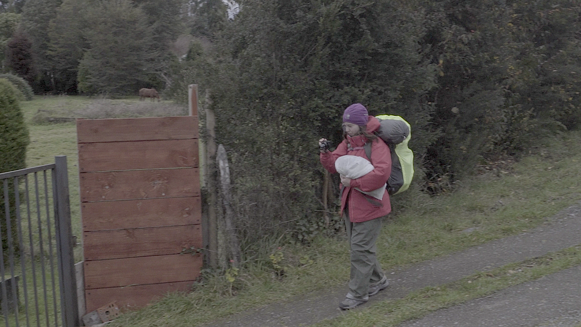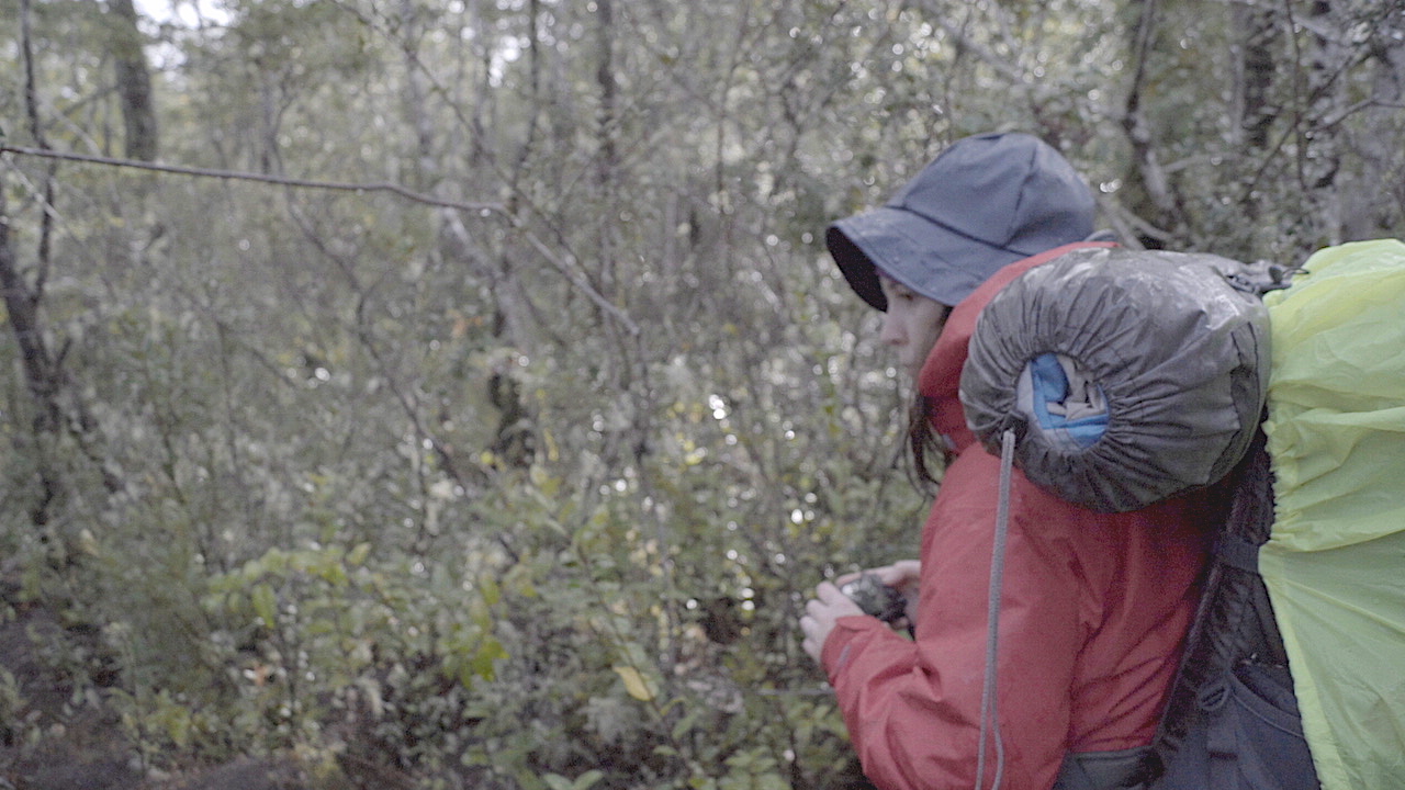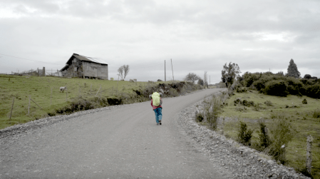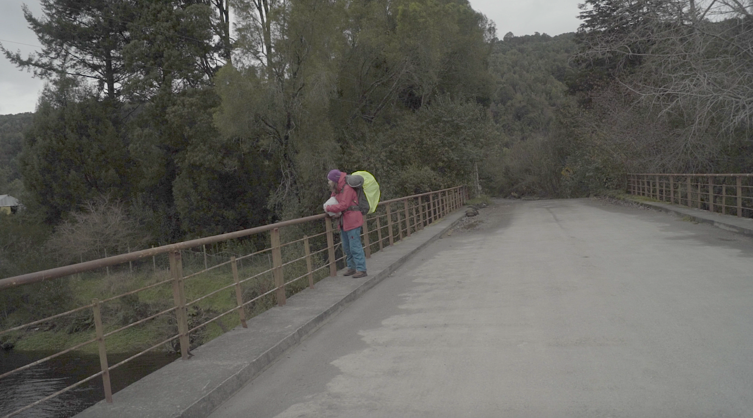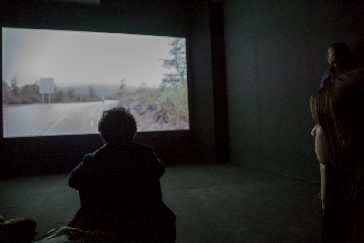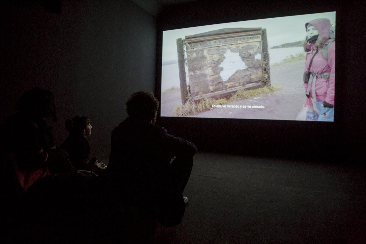 El video de la segunda sala, por su parte, es un registro del viaje que realicé en junio de ese año a la Región de los Lagos en el que registré una caminata, mochila al hombro, desde Puerto Montt hasta Ensenada, motivada por textos escritos tanto por autores como Darwin o Humboldt y como por colonos de la zona que describen la zona como un territorio indómito y de difícil acceso. Para poder ingresar a la sala de proyección el espectador debía cruzar un mural de colores primarios, blanco y negro que ocupaba parte importante de la sala.