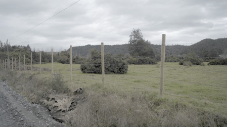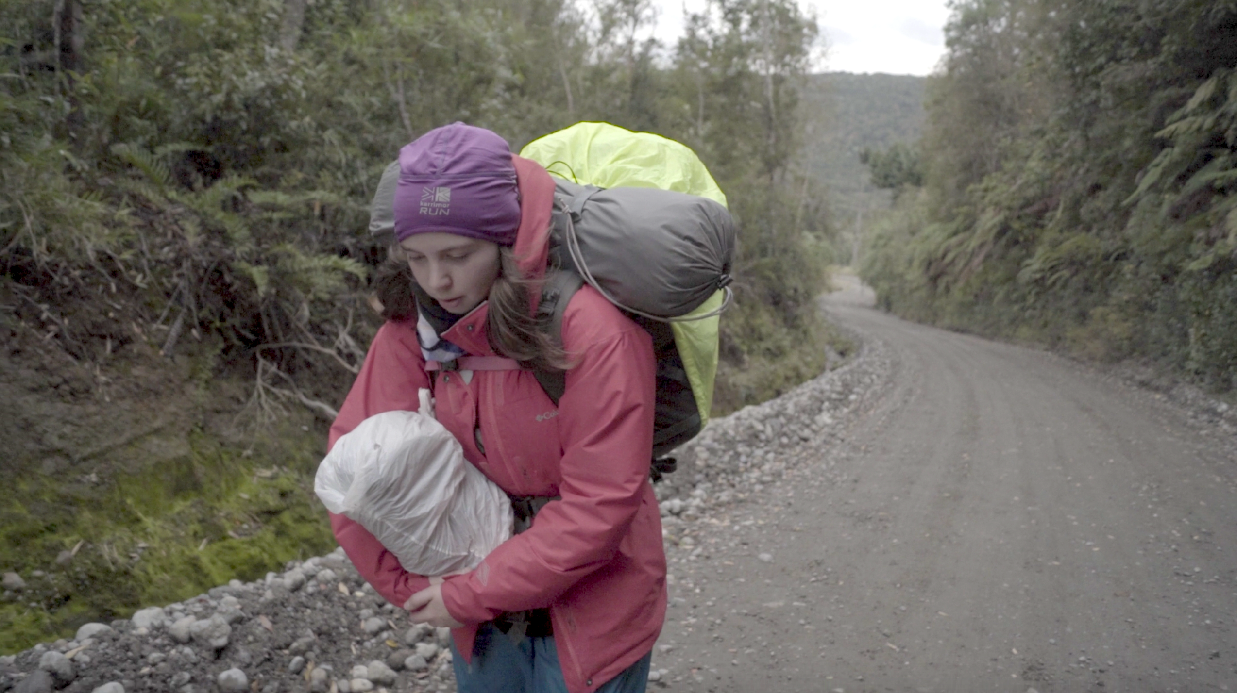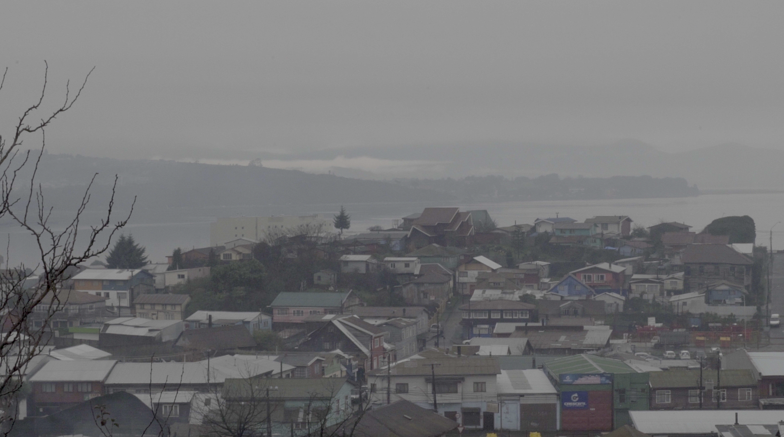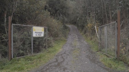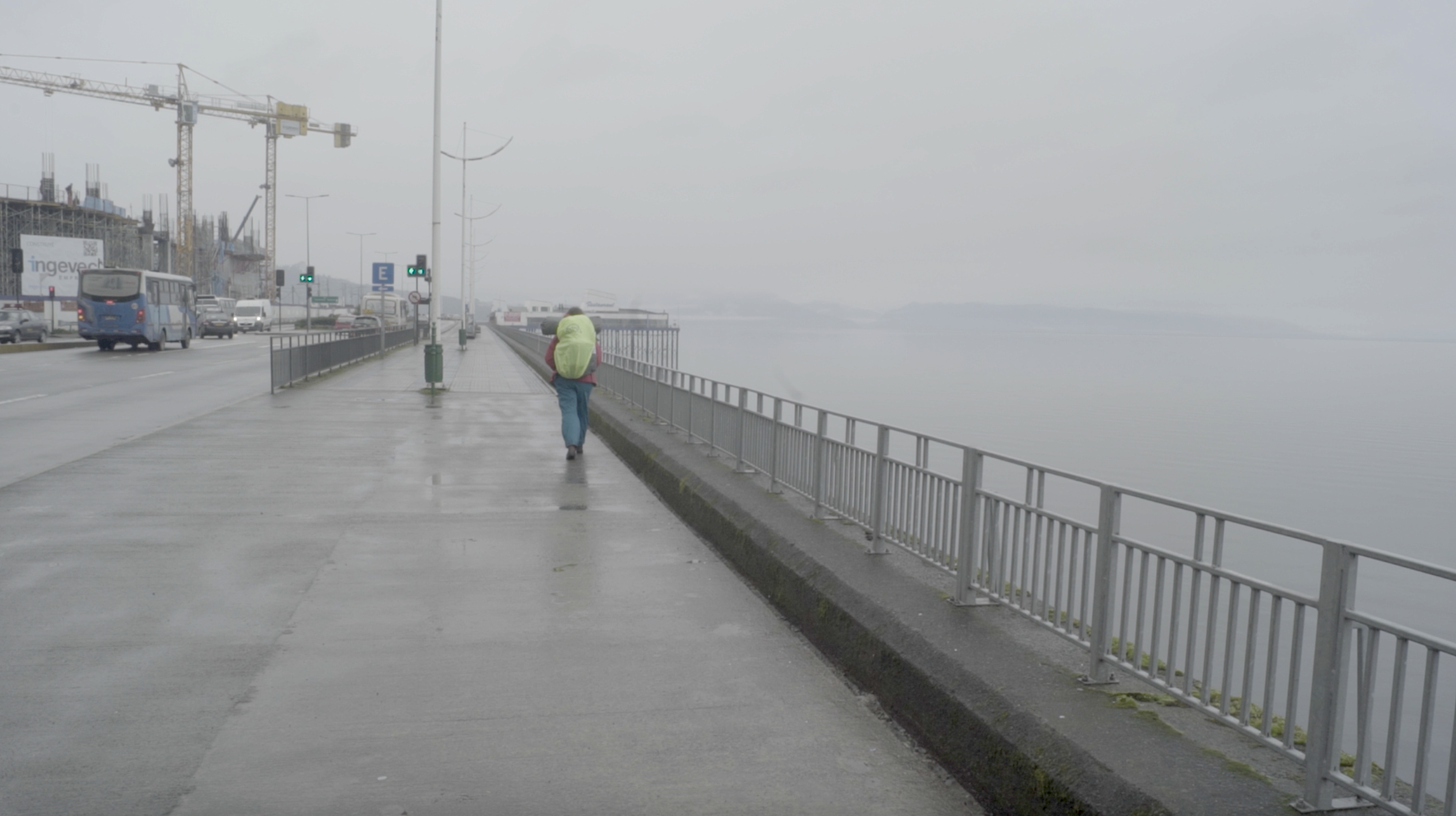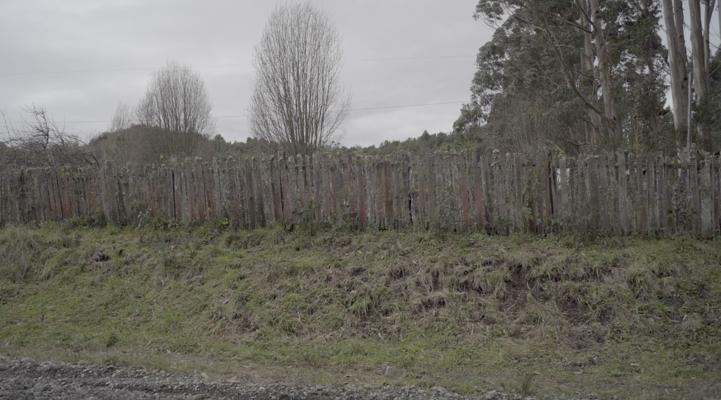 El video de la segunda sala, por su parte, es un registro del viaje que realicé en junio de ese año a la Región de los Lagos en el que registré una caminata, mochila al hombro, desde Puerto Montt hasta Ensenada, motivada por textos escritos tanto por autores como Darwin o Humboldt y como por colonos de la zona que describen la zona como un territorio indómito y de difícil acceso. Para poder ingresar a la sala de proyección el espectador debía cruzar un mural de colores primarios, blanco y negro que ocupaba parte importante de la sala.