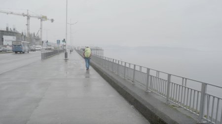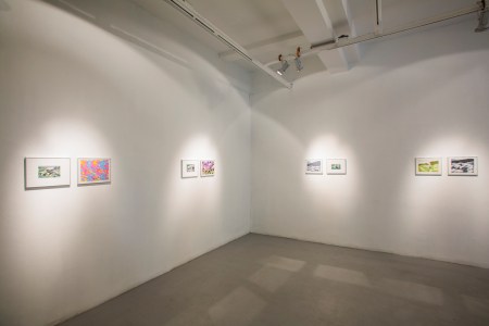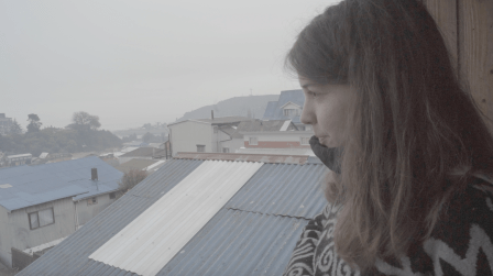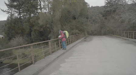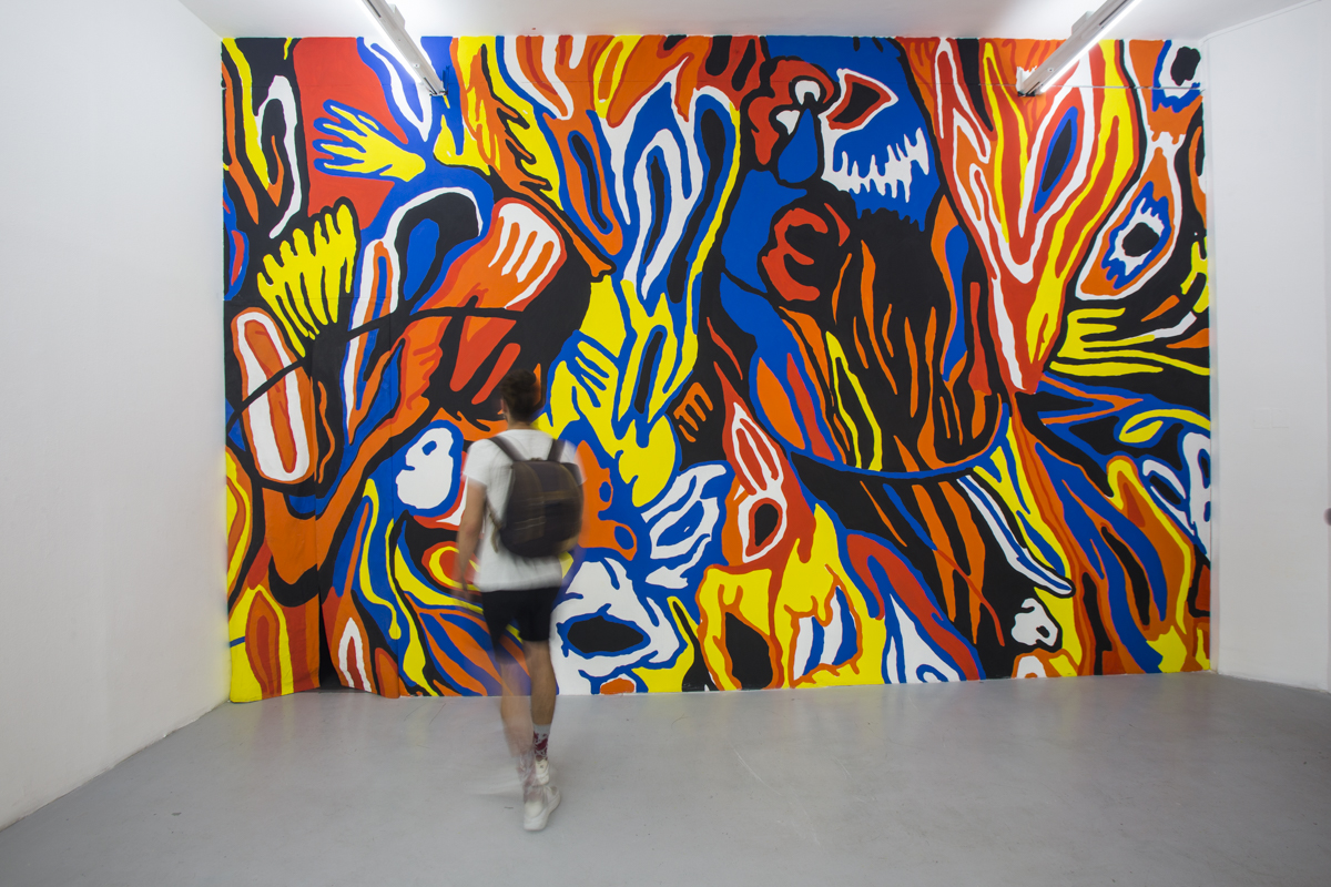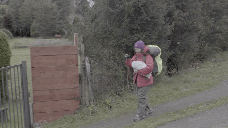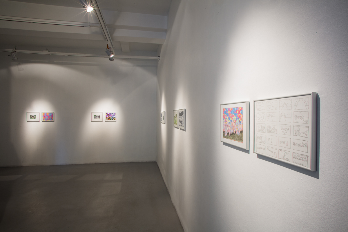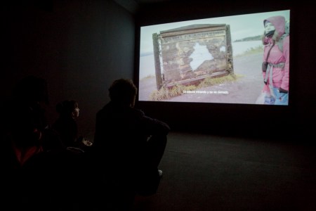 The video in the second room, on one hand, was also a registry of the backpacking trip to Region de los Lagos (in the south of Chile) I realised in June of 2017. It shows the walk from Puerto Montt to Ensenada, motivated by a variety of texts by authors such as Darwin and Humboldt as well as local colonists that describe the area as indomitable and hard to access. To enter the projection room, the spectator had to go past a wall of primary colours, black and white, that occupied an important part of the room.