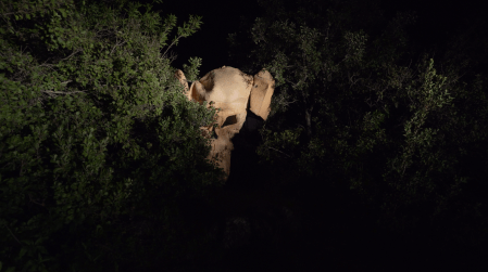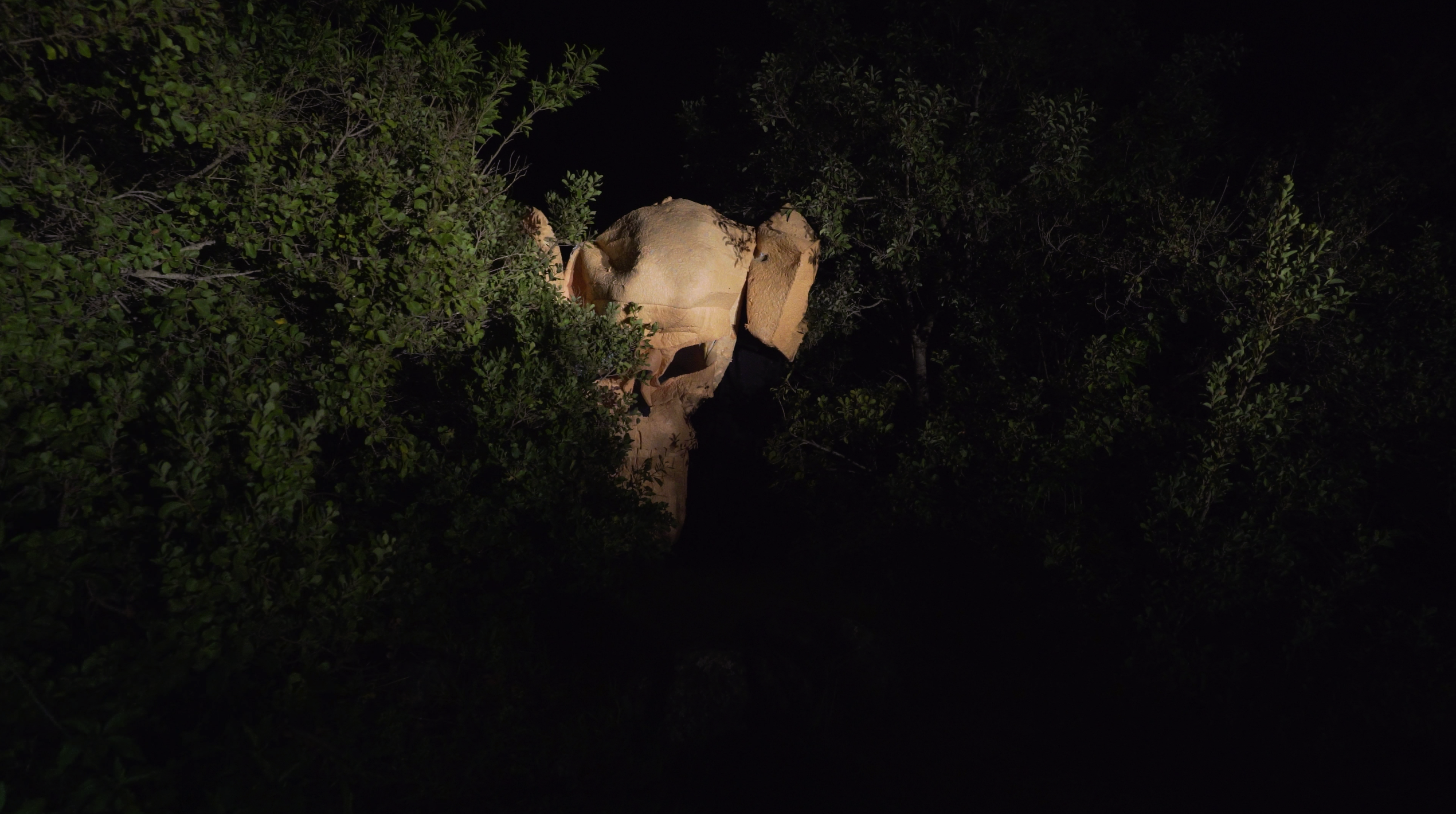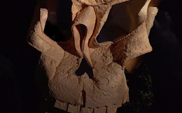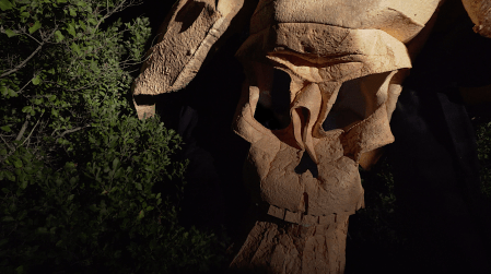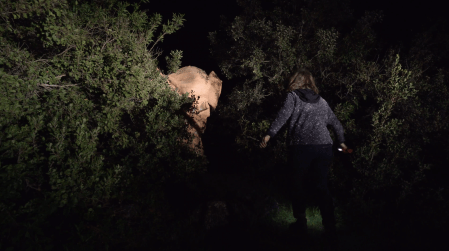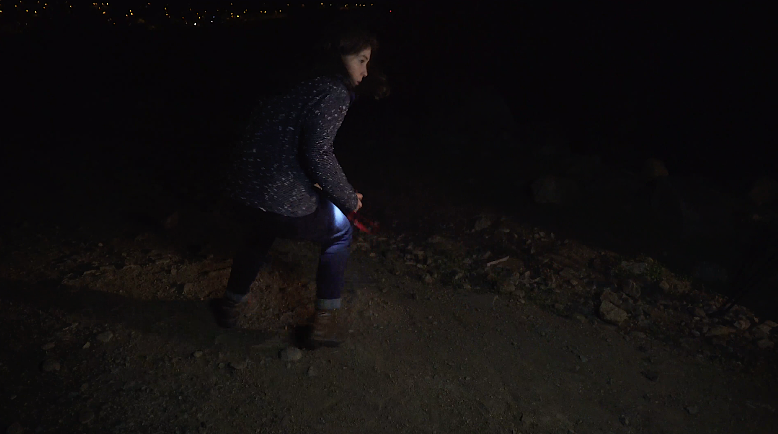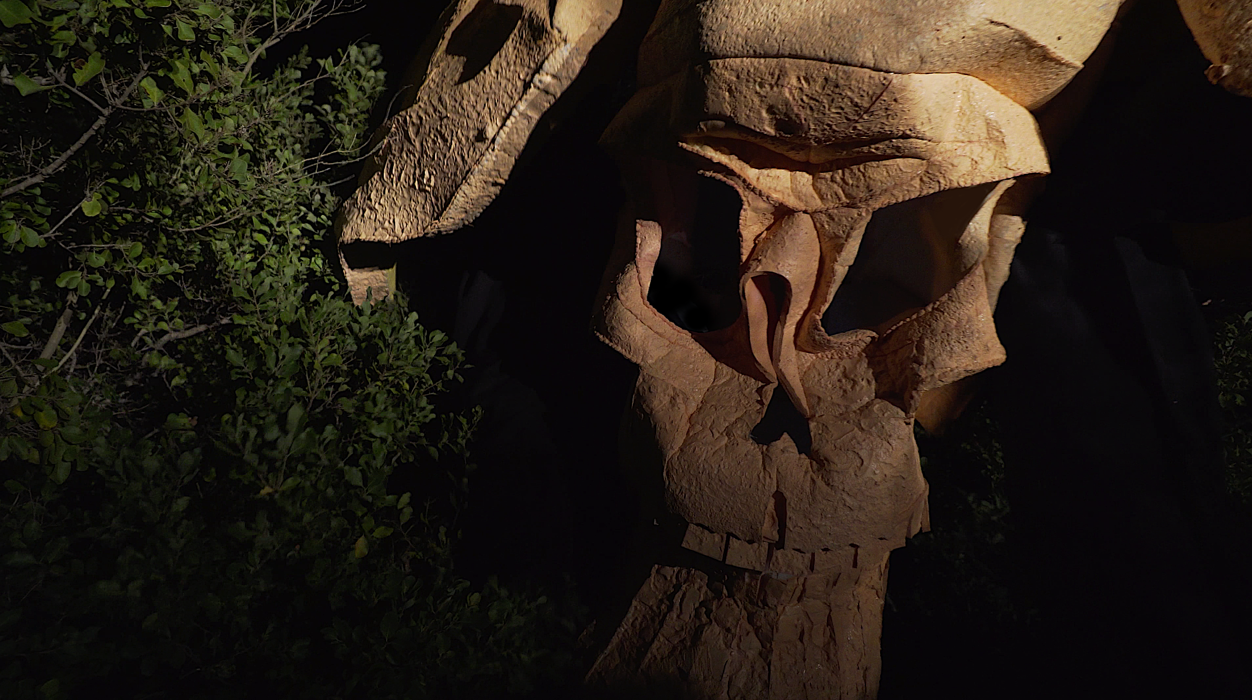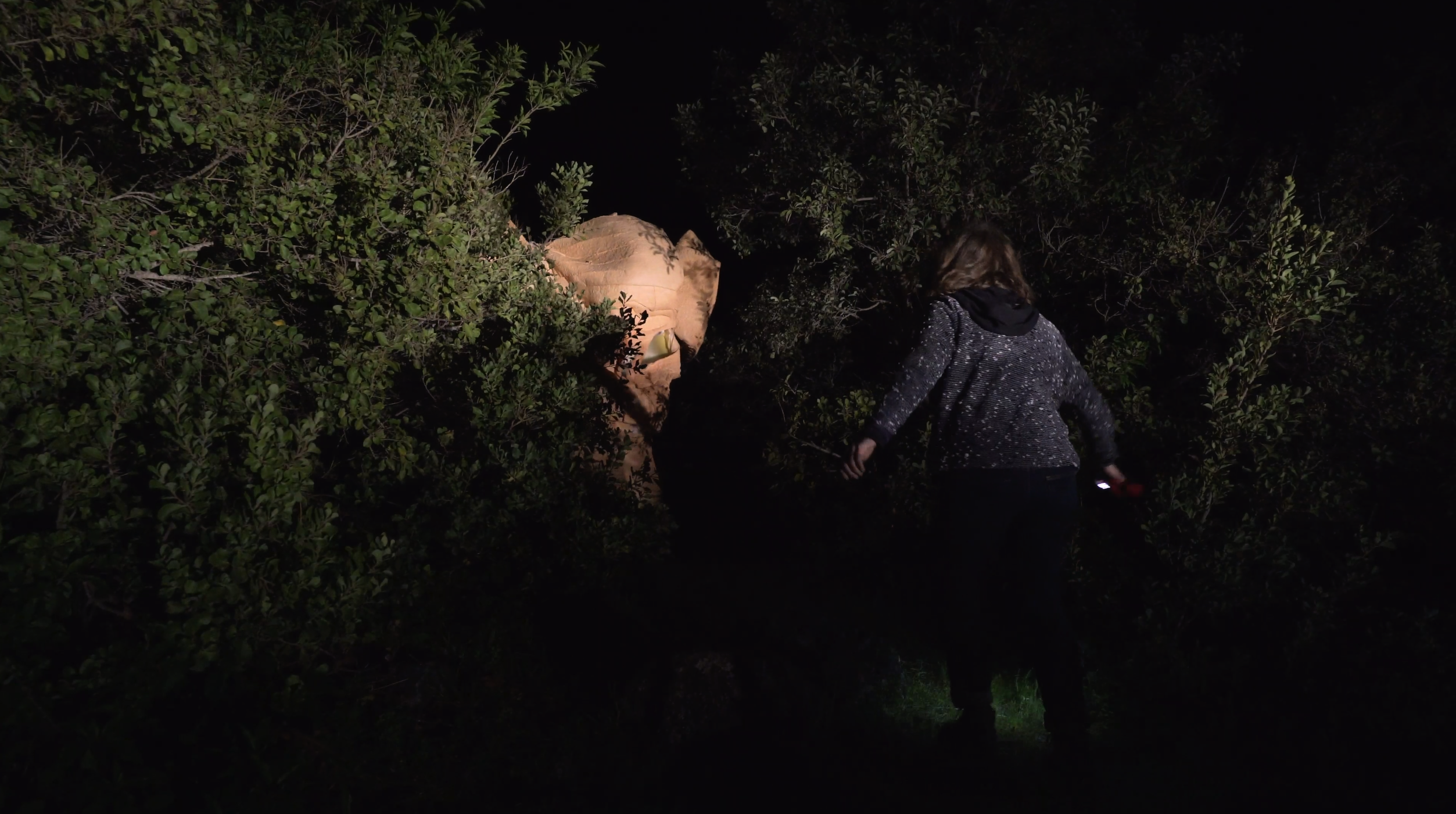The short starts with a trip through the forest being interrupted by the presence of the Chonchón. Built of painted sponge, it hangs from some rope and is carried by two people dressed in black. The Chonchón and its controllers then run after me downhill. After running for a while looking for an open space, I stop to draw the seal of Solomon to seek refuge right in its centre. Doing that, the Chonchón leaves and continues on its way.