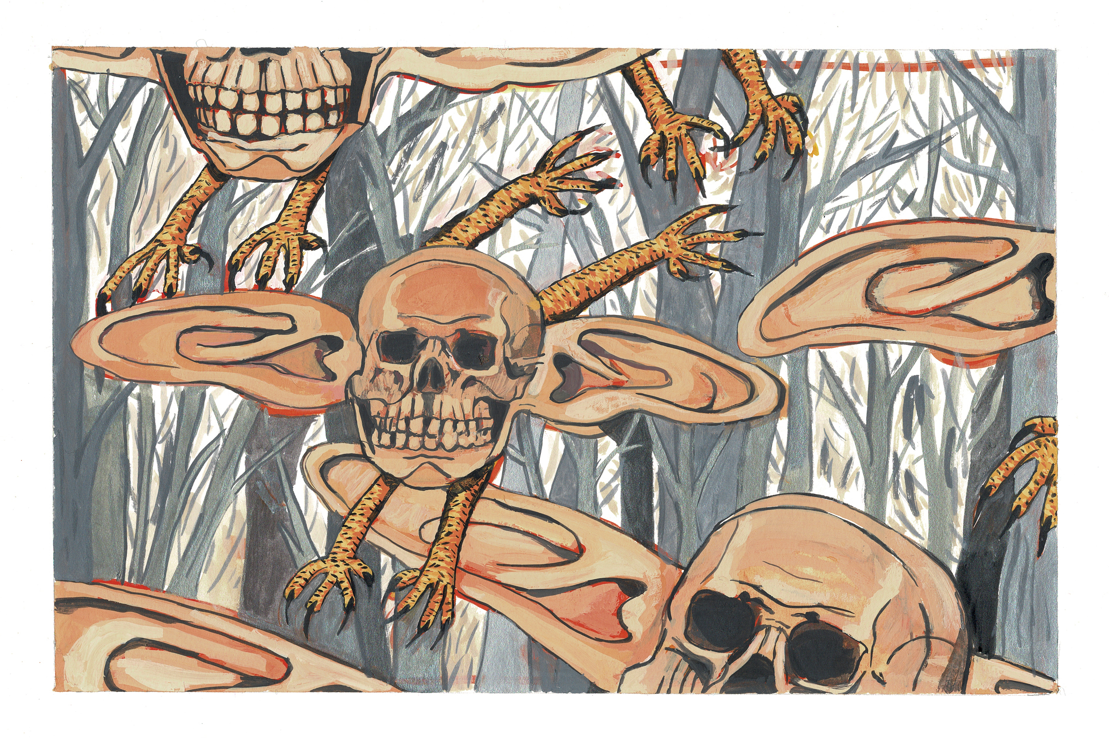 El Chonchón es un brujo que en las noches, luego de usar un ungüento especial, se desprende la cabeza del resto del cuerpo. Mientras gran parte de si queda recostado en una cama, su cabeza sale a pasear y vuela por doquier, mitad pájaro, mitad humano, buscando personas para anunciarles muerte o enfermedad. Según he leído, quien escucha un “tue tue” (nombre alternativo del brujo) es quien está condenado a morir, mientras que quienes lo ven se enfrentan a la enfermedad. Hay muchas formas de evitar al Chonchón: existen palabras precisas, dibujos en el suelo (como la estrella de Salomón), pero uno no puede quedar nunca indiferente a su presencia.