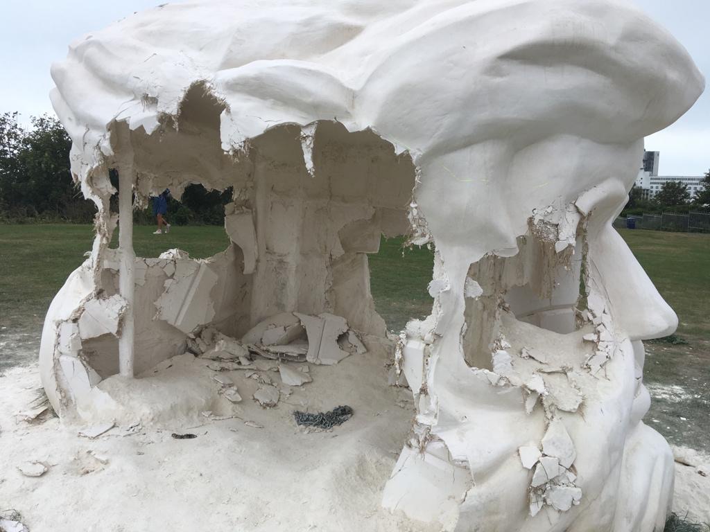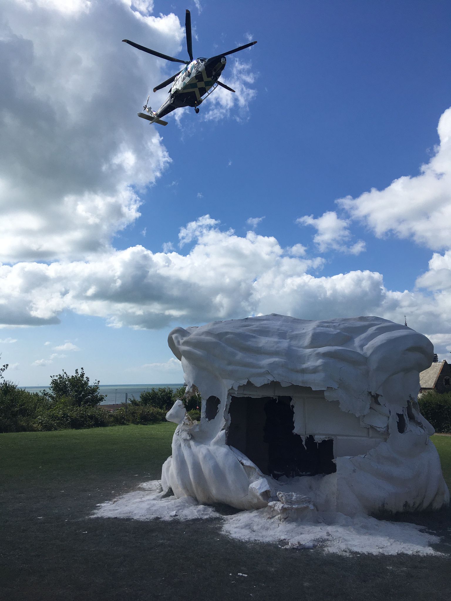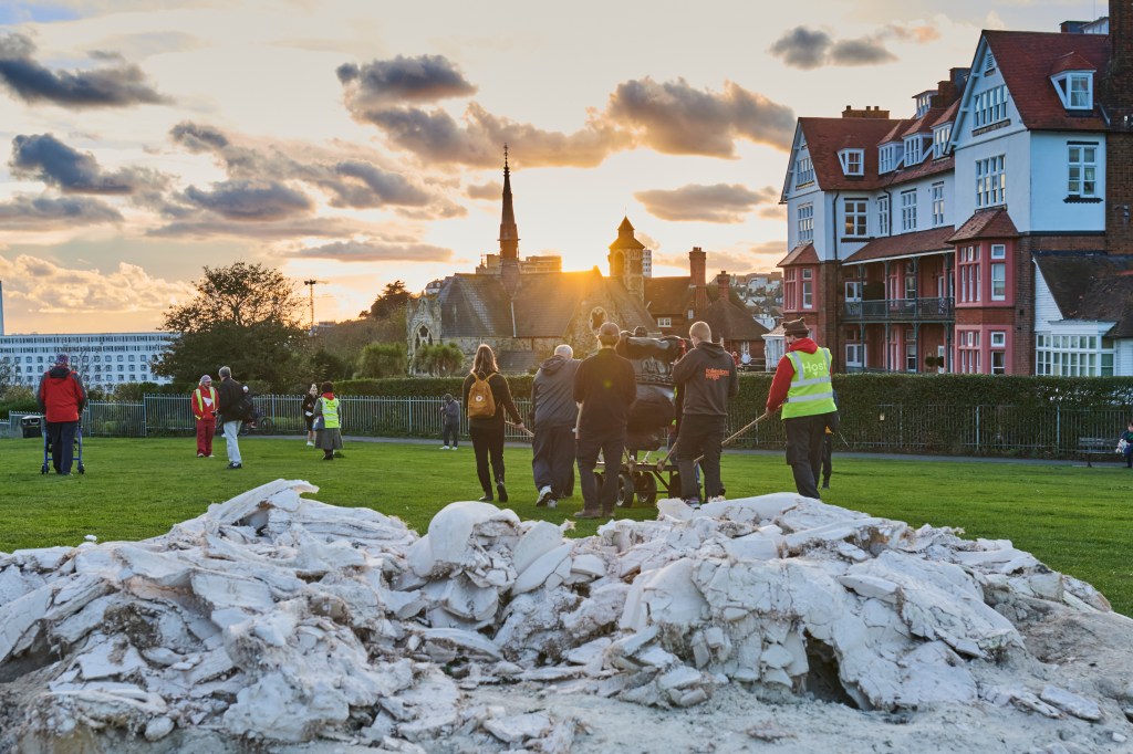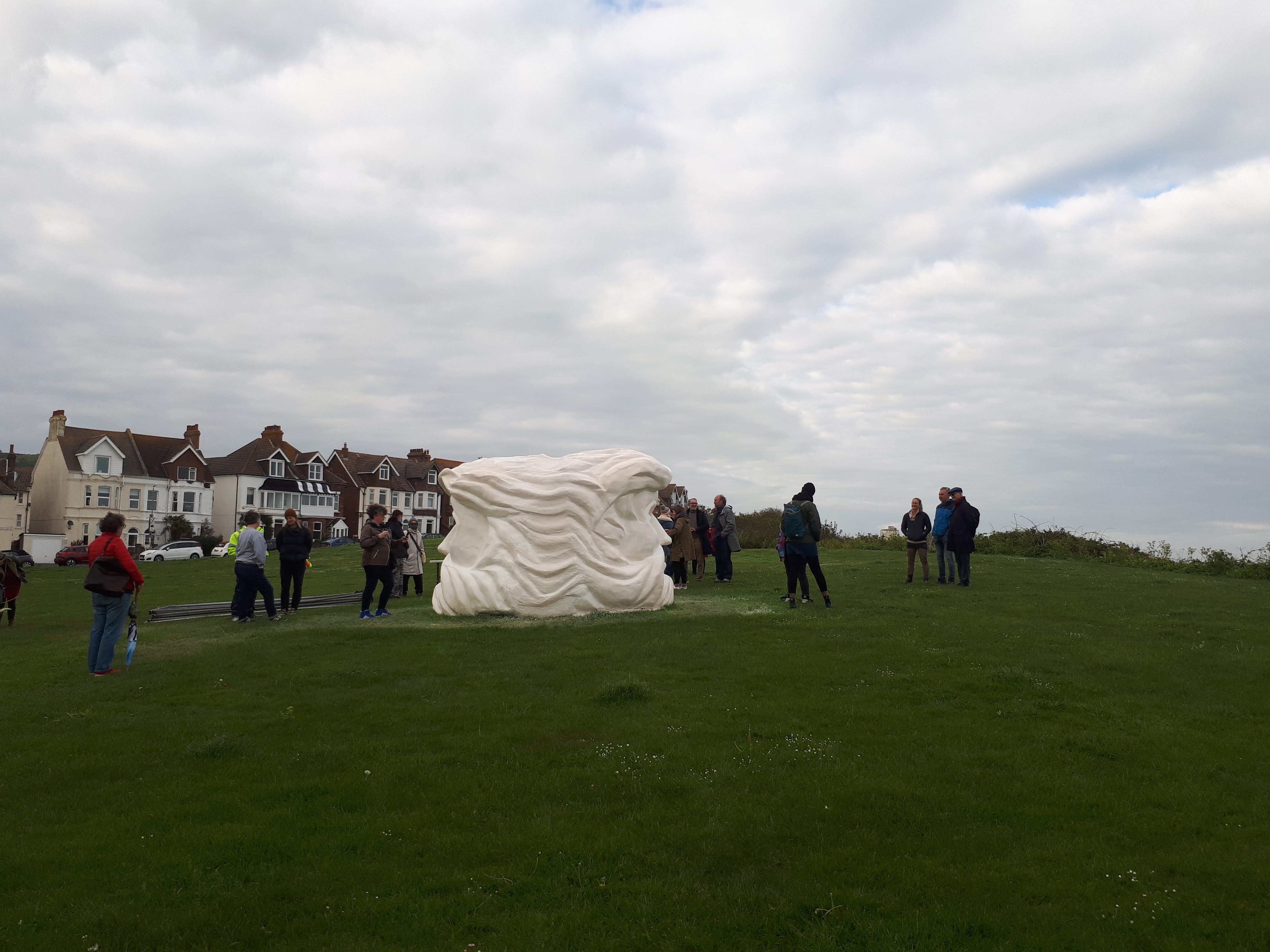 La gran escultura estaba hecha de un compuesto de yeso cuidadosamente calibrado que se asemeja a los acantilados de tiza cercanos, y su sustancia es igualmente susceptible a la intemperie y a la interacción humana, susceptible como la erosión del acantilado a desintegrarse con el tiempo. Cedo el control de la obra a los materiales a través de su fragilidad y metamorfosis inherentes, y así intento nuevamente aceptar un poco más la idea de mortalidad y no poder controlar la vida. Es una especie de “monumento a la incertidumbre”.