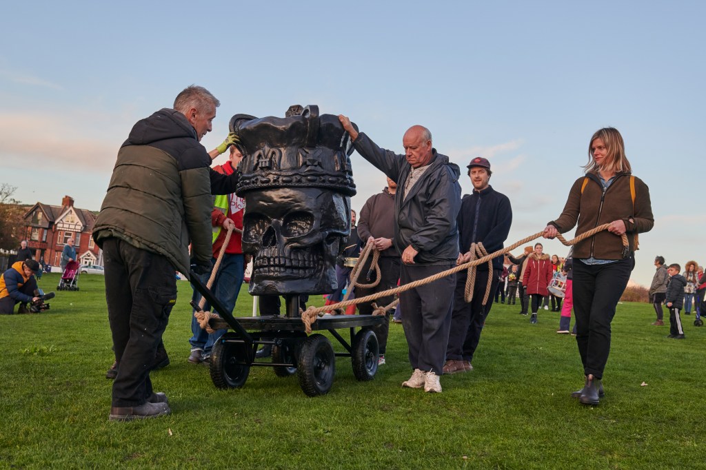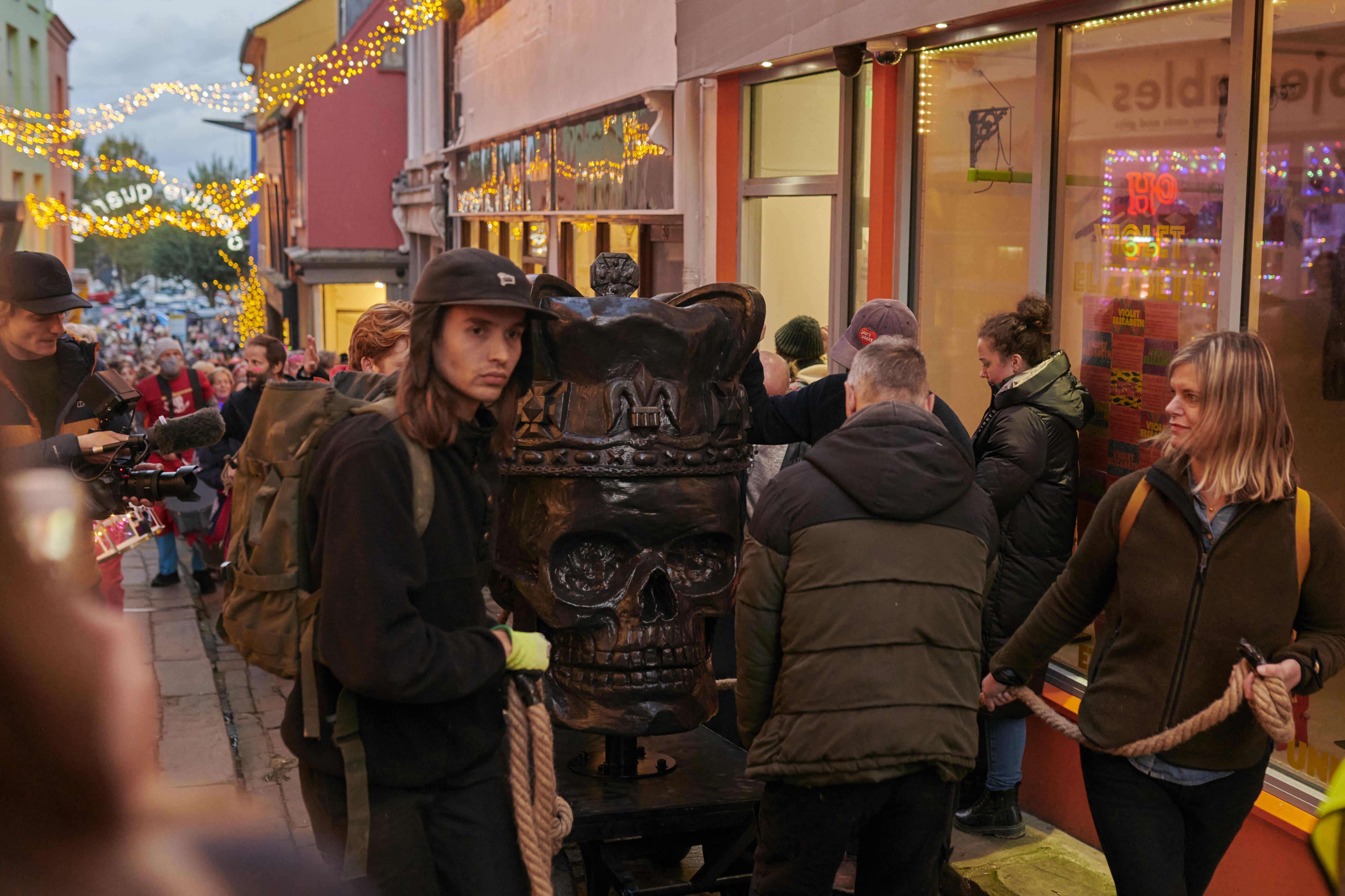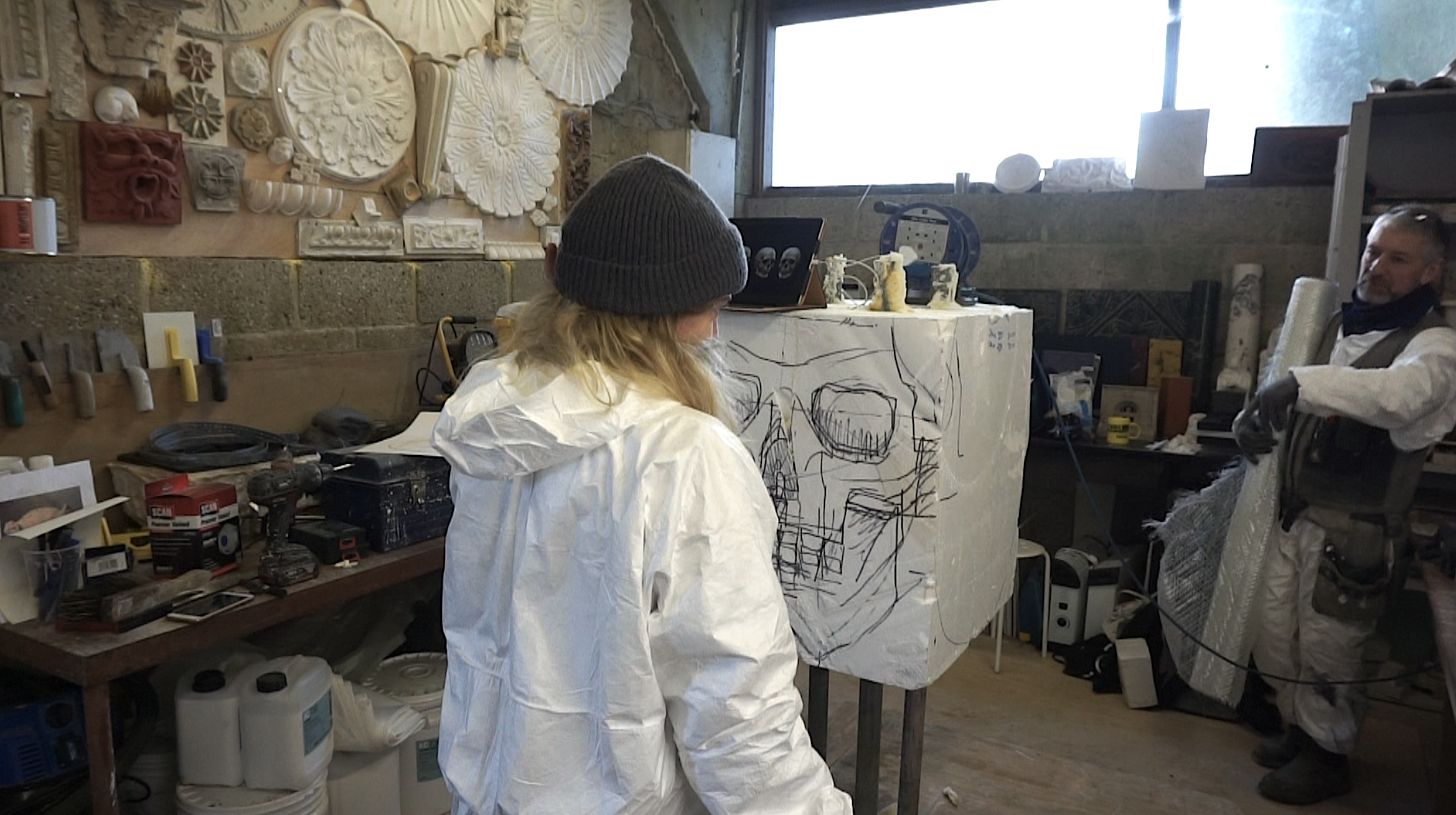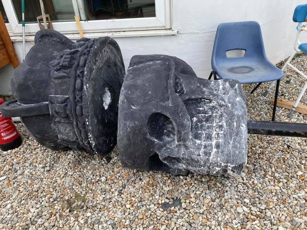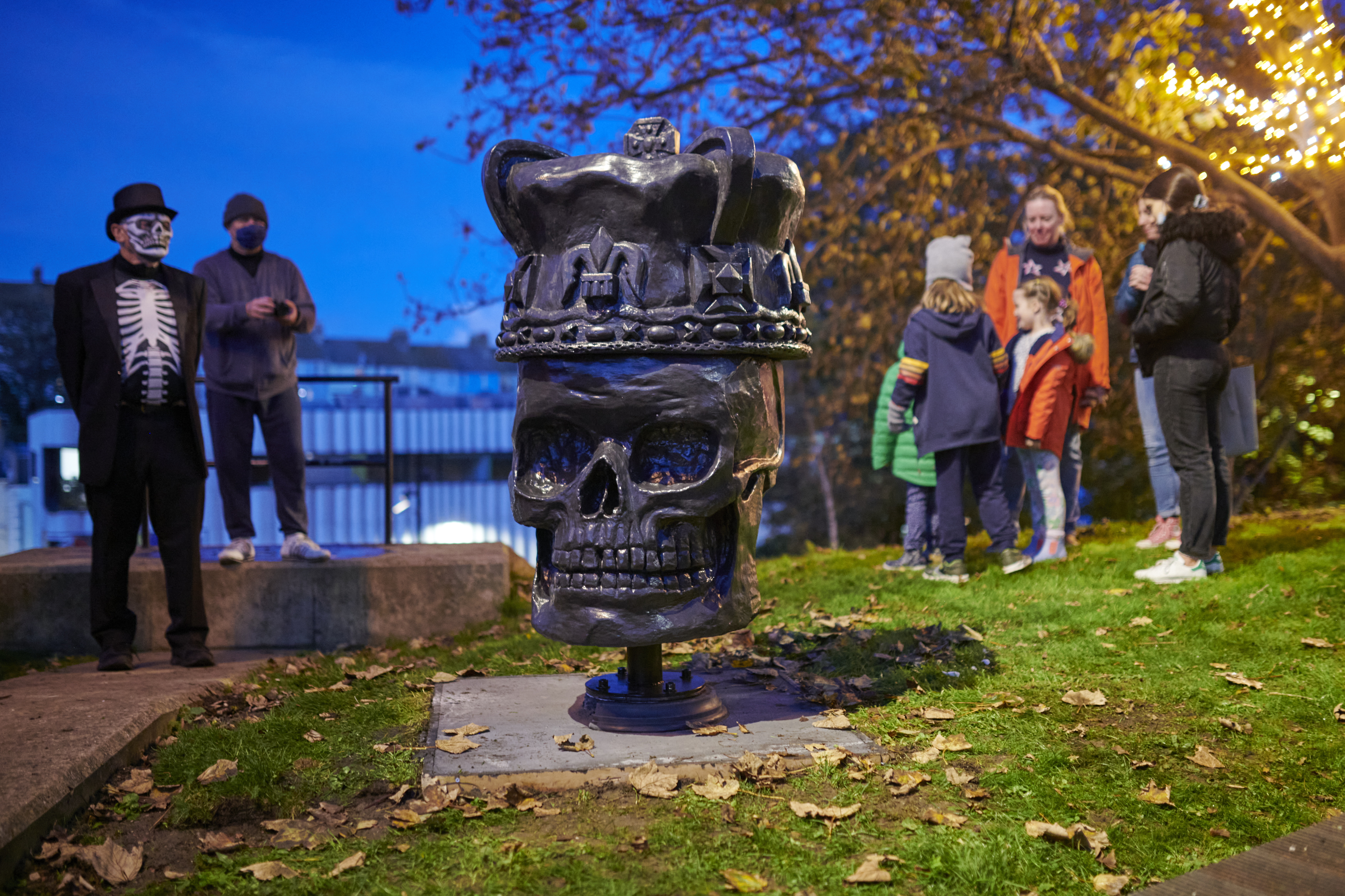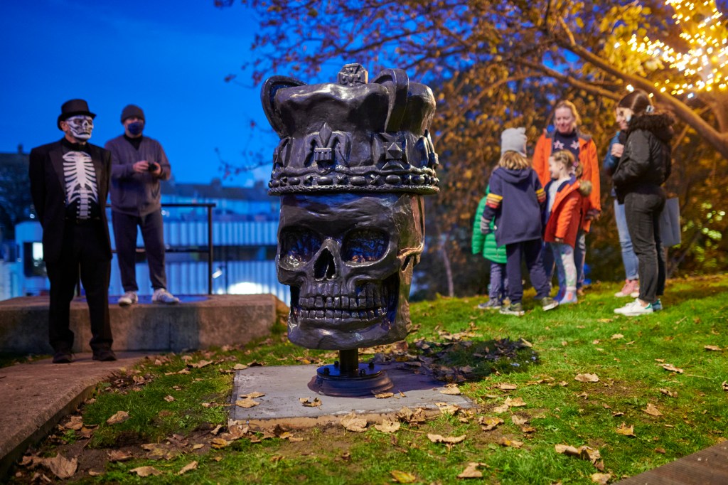 The crowned skull is currently installed in the park next to the building that houses the triennial offices.