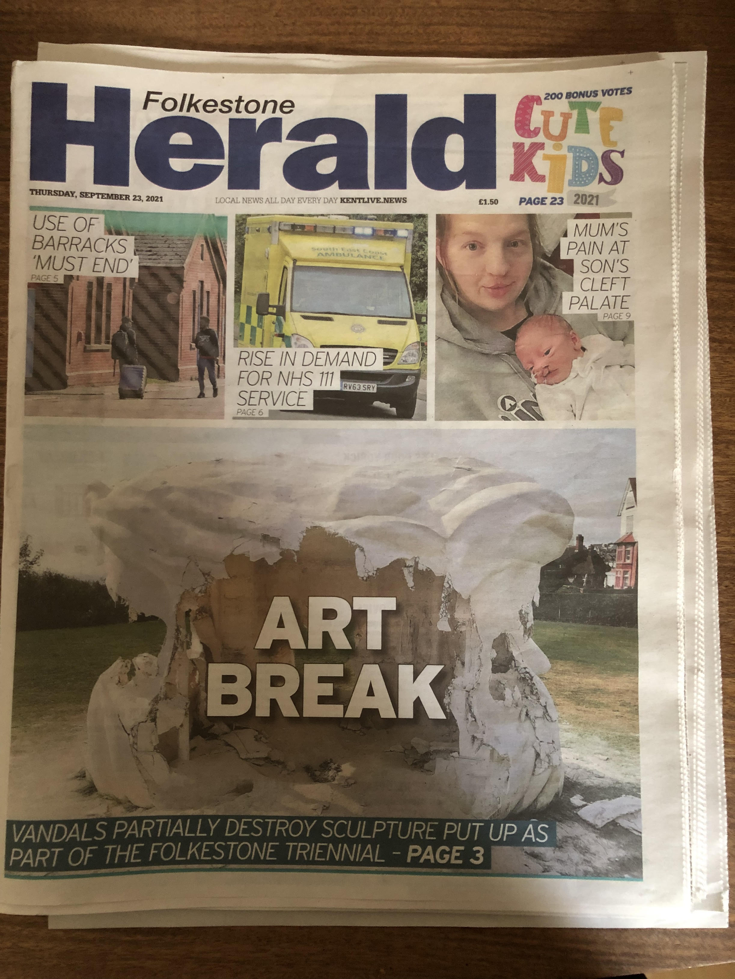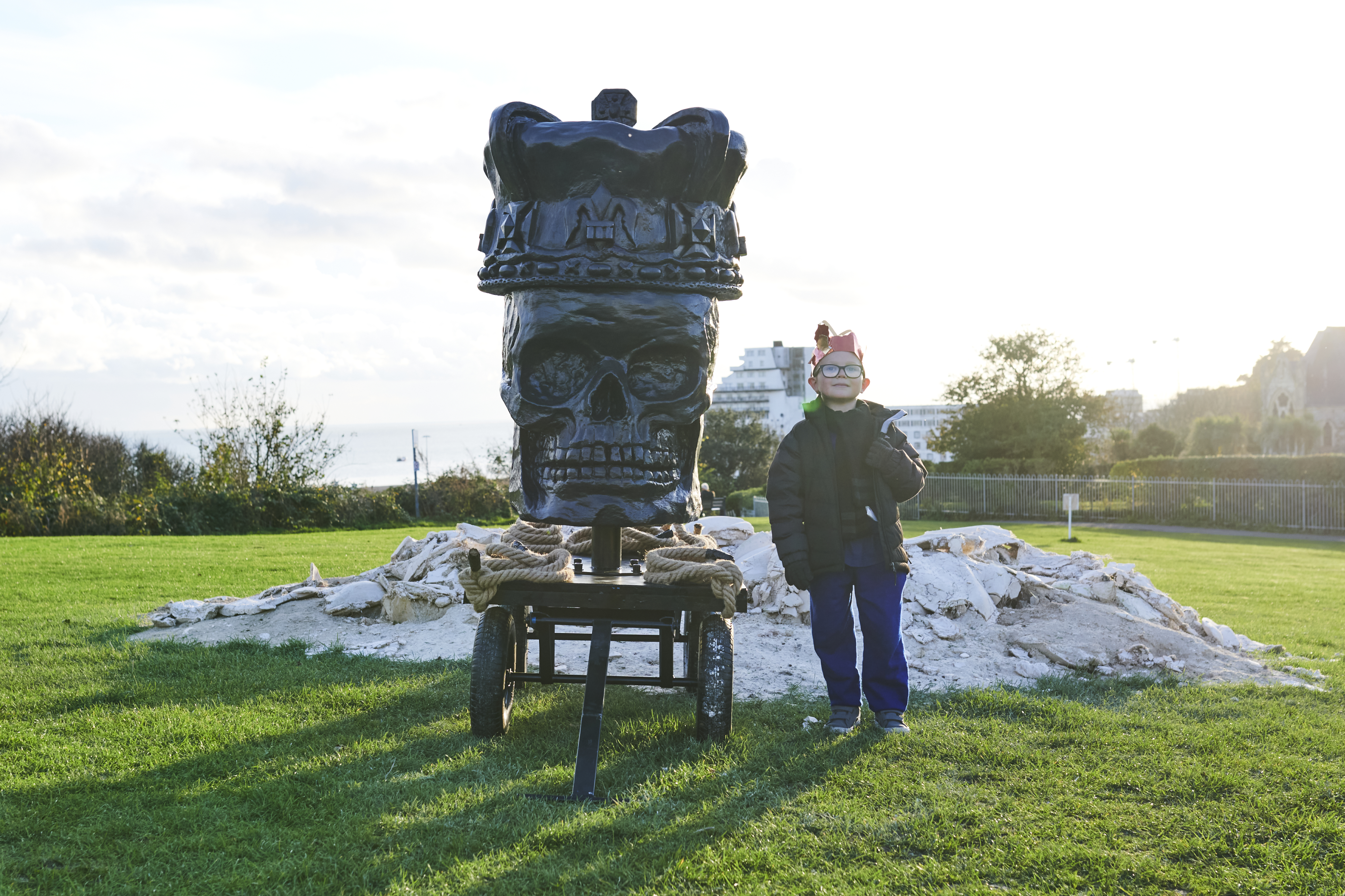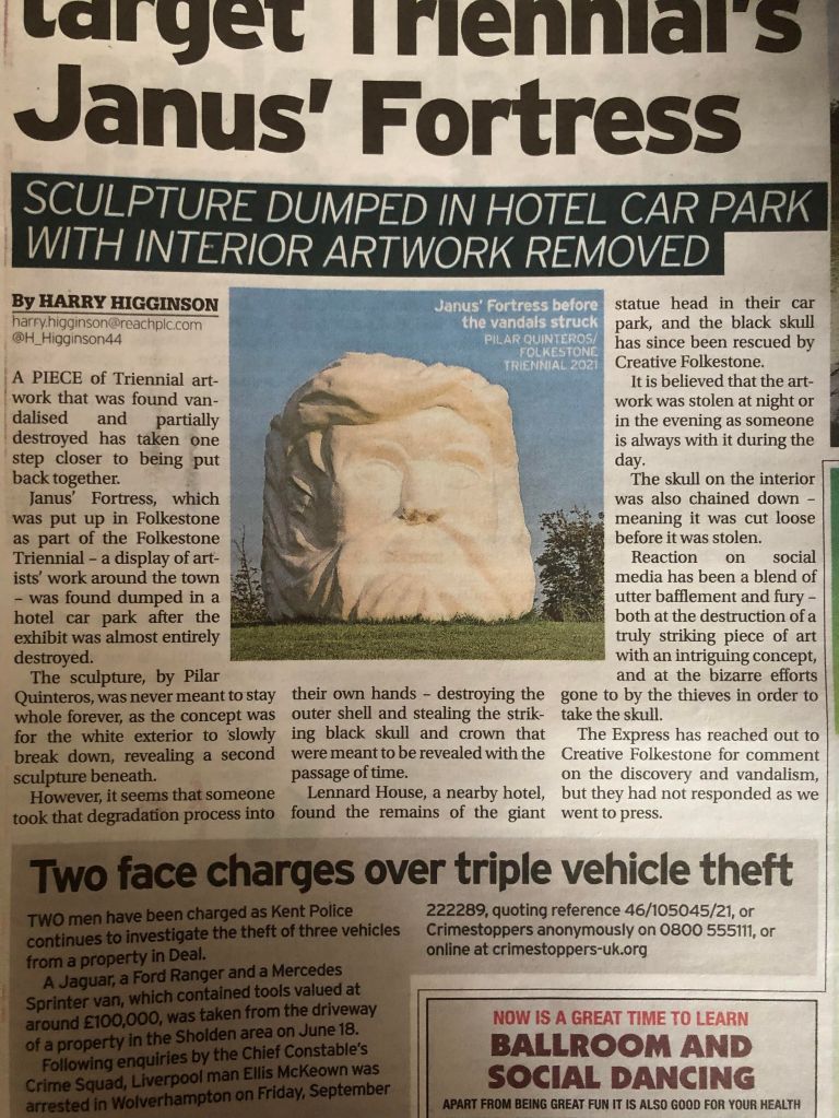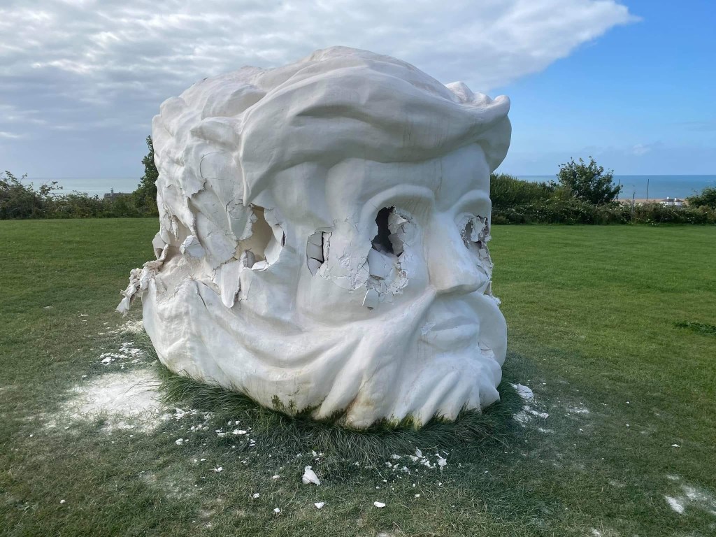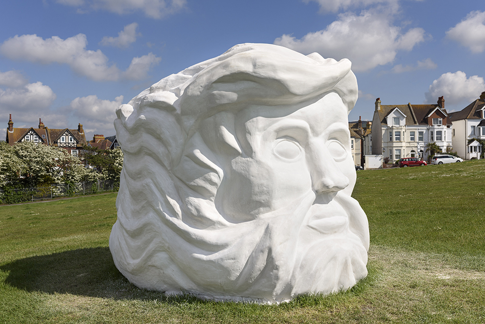 ‘Janus Fortress: Folkestone’, curated by Tamsin Dillon, is a multifaceted work located on the cliff-top overlooking the town. In ancient Roman religion and myth, Janus was the god of beginnings, gates, transitions, time, duality, doorways, passages, frames and endings, usually depicted with two faces. The sculpture I presented in Folkestone, which likewise presents two faces — one faced inland and the other gazing at the sea — symbolises the duality of borders: of looking outwards while protecting inwards, a dichotomy that both Brexit and the pandemic have made extremely pronounced.