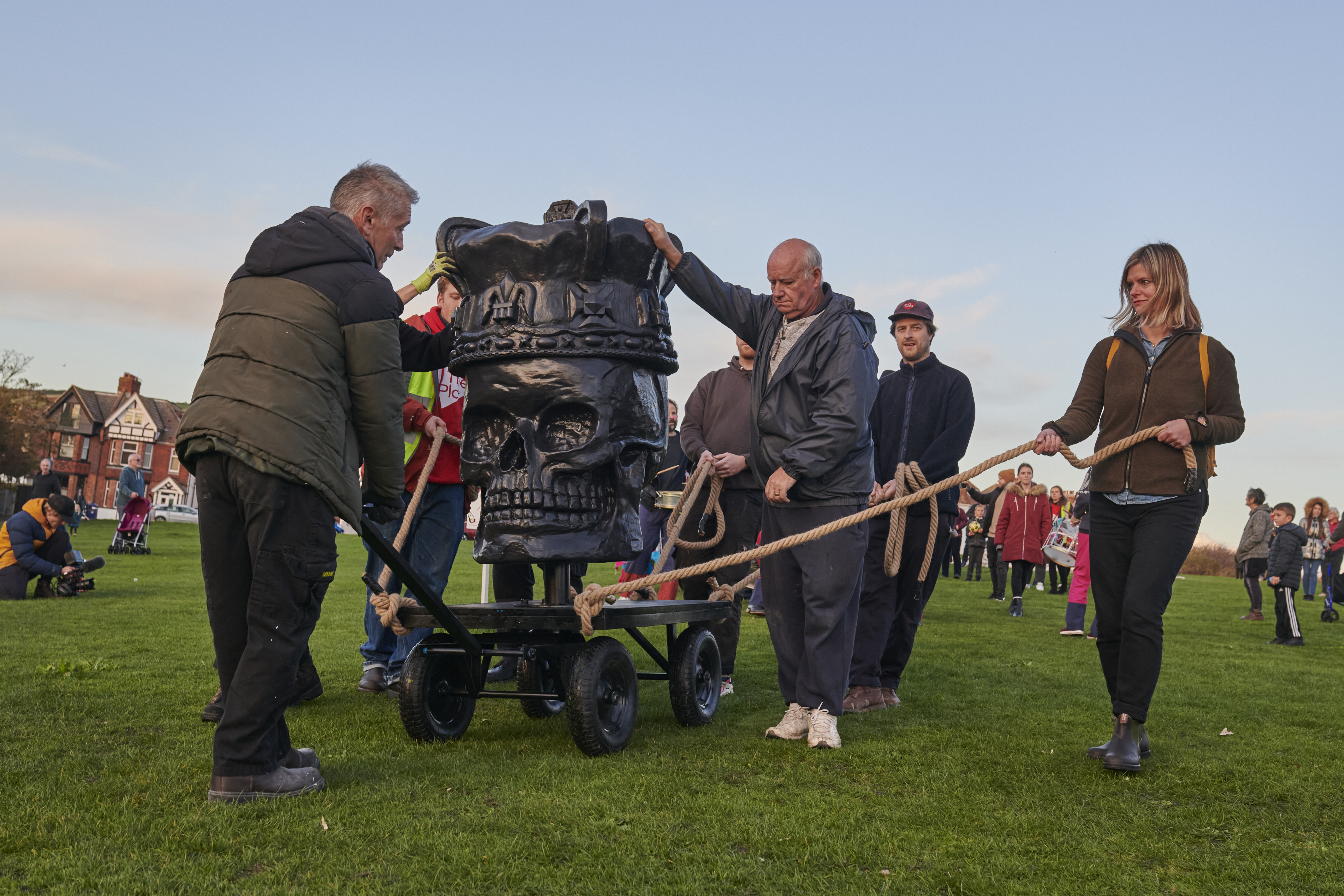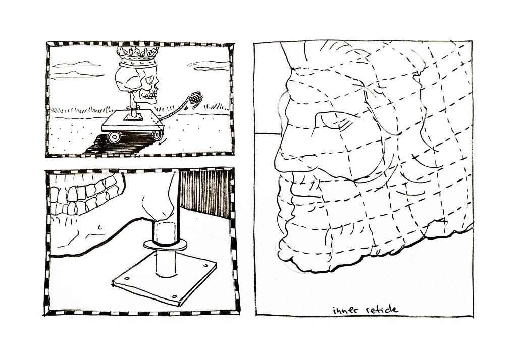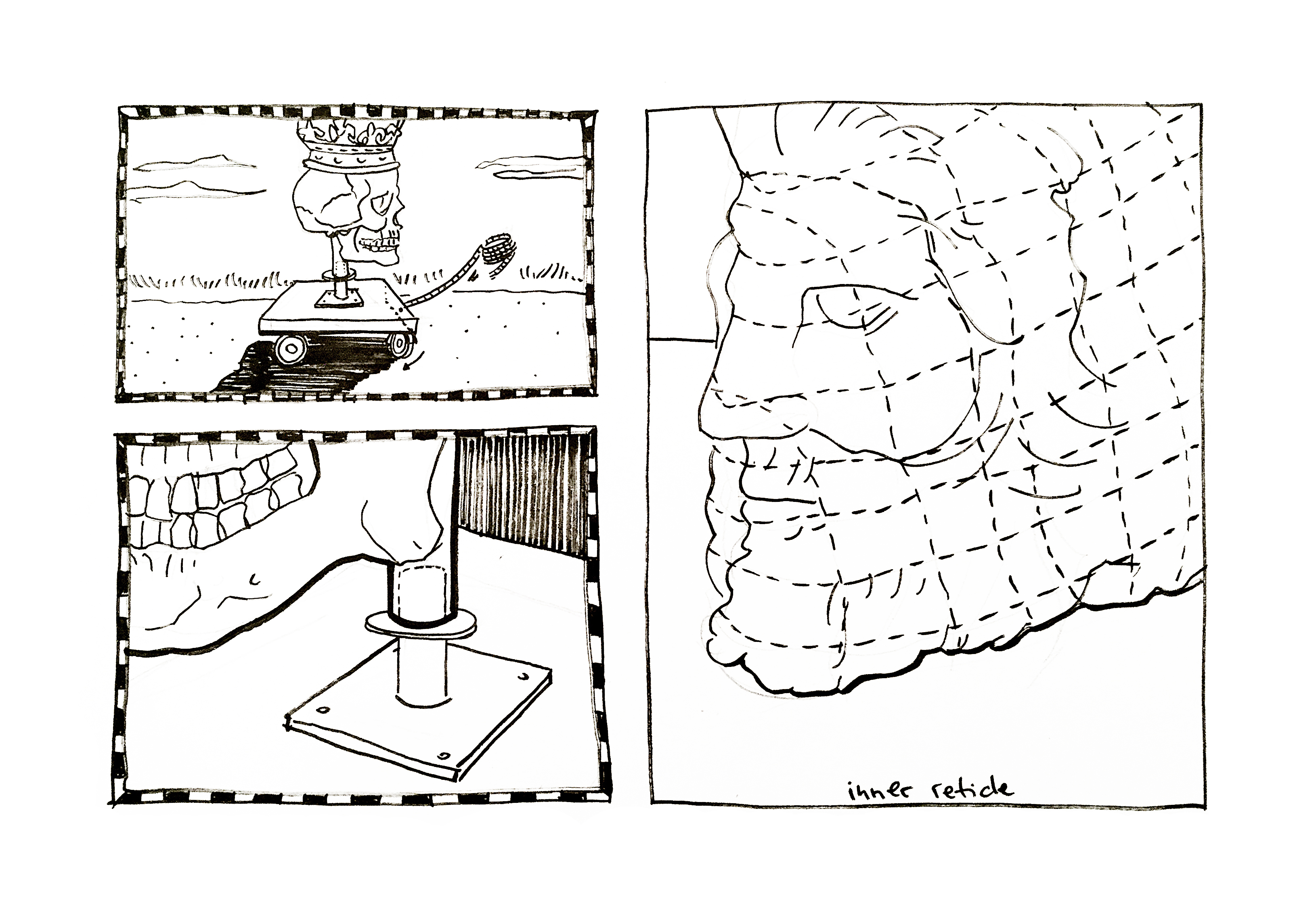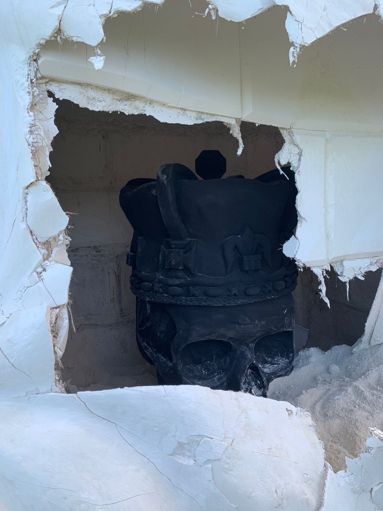 Una vez que el yeso se desintegró por completo, una figura concéntrica emergió del interior de la escultura: una calavera coronada, construida con un material mucho más resistente que la primera. Esta segunda escultura también cambia con el tiempo: la dirección a la que mira la calavera coronada. Como parte de un parque público de juego de niños, la calavera negra y abarrotada funciona como una veleta que la gente puede orientar. La muerte cambia de dirección; hacia dónde mira ahora es algo que los visitantes pueden decidir.