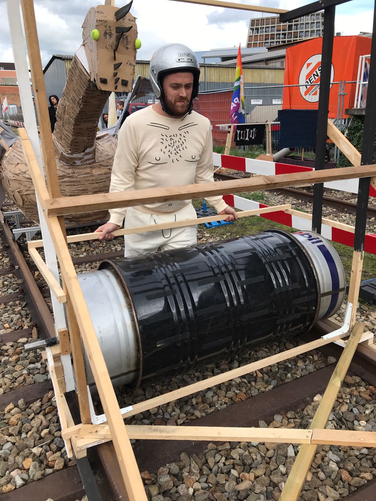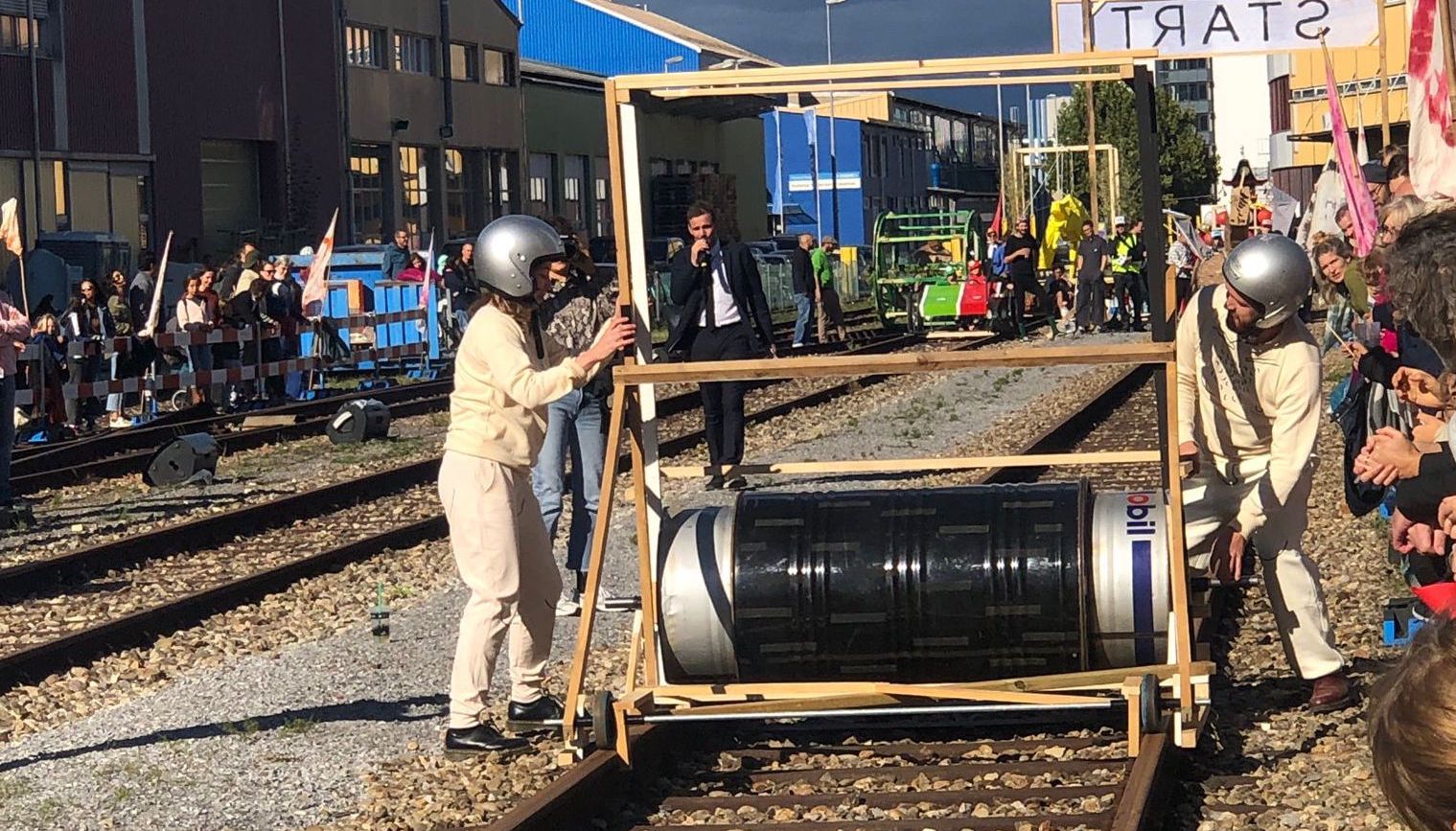 La idea central de la competencia creada por Beni, que ya va en su sexta versión, es crear carros que, como pie forzado, no se arrastren ni tiren. Nuestro proyecto consistió en construir con materiales principalmente encontrados (con un presupuesto de 200 CHF era nuestra opción) un carro hecho de barriles de aceite que nos permitieran correr la carrera en sentido contrario sobre ellos. A su vez, utilizamos como vestuario trajes que representaban nuestros cuerpos desnudos. Así jugamos con la idea de que, representando a Chile, corrimos al revés totalmente expuestos y con recursos mínimos. Nuestro carro se fue desarmando en el transcurso de la carrera y nuestra participación fue algo desastrosa, pero no lo suficiente ni siquiera como para ganar el premio al “Fracaso más hermoso”. Aún así hicimos lo posible y toda la experiencia la recordamos como un sueño en que todo tenía sentido en sí mismo.